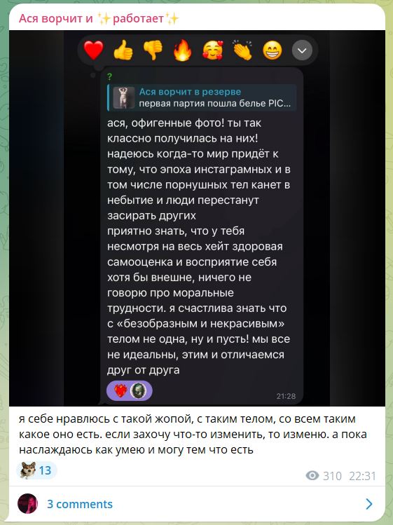 Я уже даже не удивляюсь. Закономерный итог всего этого копиума про принятие себя и своего тела. Такие девушки постоянно шитпостят тем, как принимают себя, потом втихую резекция/оземпик и сказки о том, что похудела из-за принятия себя и любви к себе, как же иначе.