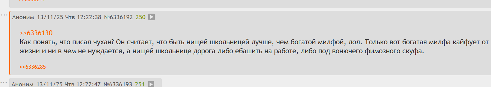 >>6341040 Не, я младше. >фемцел королева" Ебать, ну ты ещё более шизовых людей почитай, чтобы свою картину мира построить. Да, и фантазии, где скуфы тебя содержат потому, что ты такая особенная, а они чувствуют в тебе классную нетакусю с милой мордашкой разбиваются об реальность, где тебя насилует потный и грязный скуф, пока его дома дочки твоего возраста ждут. В фантазиях легко быть темнотриадницей без чувств, но в реальности почему-то наименьший процент проституток потом в жизни реализовываются хоть как-то. Большинство либо на допинге гниёт, либо в канаве валяются.