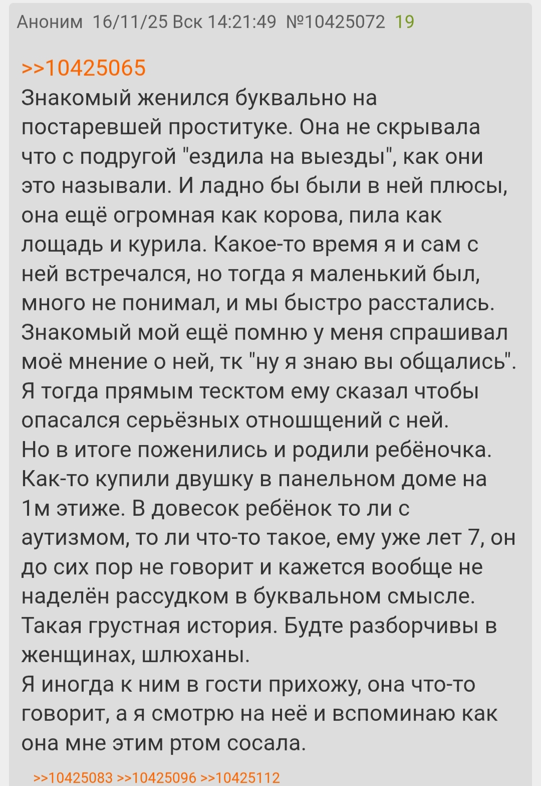 >>6341653 Потому что заканчивается пробный период, когда чушок прикидывается человек и начинает его реальное отношение: как к служанке-пососалке. Шурши по дому, давай пизду на проеб, не будь слишком веселой, не будь слишком грустной, не требуй от меня ничего, не ожидай от меня ничего, закрывай глаза на то как я любезничаю с другими женщинами, при этом сама должна быть безупречной в этом плане, будь мне всем обязаной, будь мне всегда должна, будь виноватой за все, оправдывайся за каждое слово, выслушивай претензии, не имей права жаловаться или быть недовольной таким отношением иначе ты ебанутая и истеричка. Ах да, еще так или иначе придется взаимодействовать с его ебанутой семейкой, смотреть как ебанутый папаша гоняет мать терпилу, а корзиночка все это сидит и впитывает, как они все вместе пристально рассмотривают тебя на предмет будешь ли ты хорошим инкубатором и не опозоришь ли их великий род.