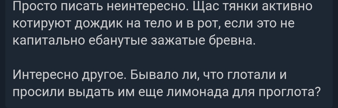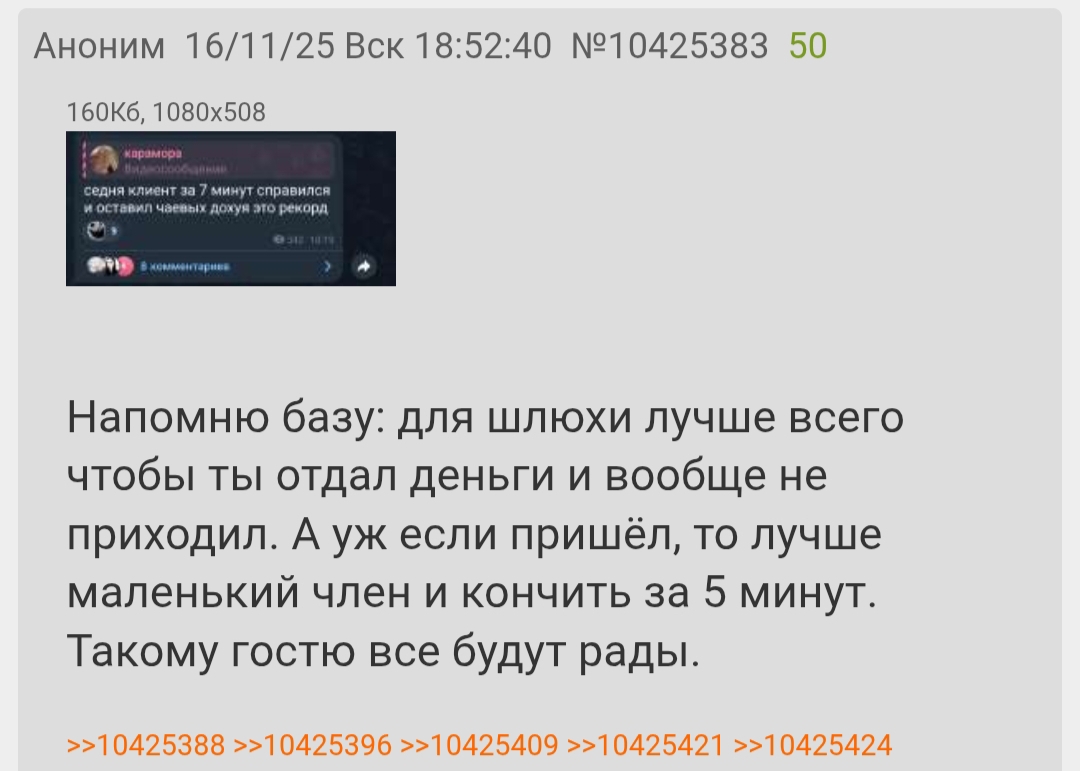 Мне вот лично куда больший пиздец, что это дерьмо нормализуется. Ладно проститутки, они просто спросом пользуются. Большая проблема эта потаскуны всякие, которые ЗППП разносят, бабки из бюджета семьи тратят. И это все абсолютно обычные мужики, которые нихера в этом страшного не видят, а то и ноют, что им же писик нужон, пожалейте блять их.