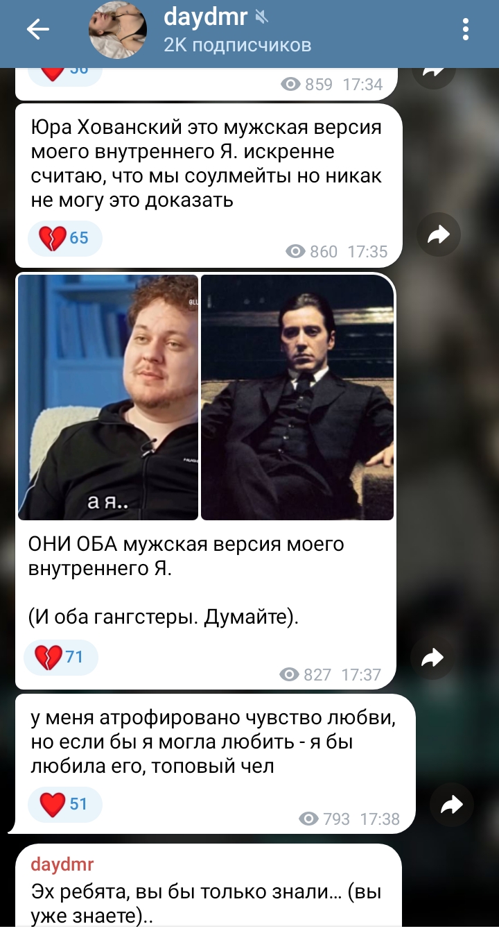 >>6341643 1. Малолетка из обычной семьи 2. На 5 лет младше, но имеет статус «папочка звёздочки», когда у самой Офелии «звёздочка папы», т.е. контингент понятен, тем более он её подписчик. А Фрея у них кто в семье ебанутых? Бабушка нахуй? Уморительно было, когда малолетка сводил покушац в жиальню, а она выкатила пост «я теперь не согласна на меньшее», лол.