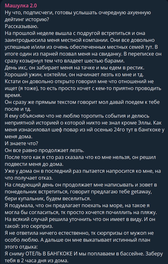 Еще у Офелии конечно же было прл, она уже живя с боровом с ребенком на руках в коммуналке писала простыни текста как скучает по бывшему, хоть и понимает как это неправильно, а с бывшим она жила в 16лвл в его мухосрани, где он ее пиздил, словесно унижал еще и сломал руку ей при очередной пиздиловке