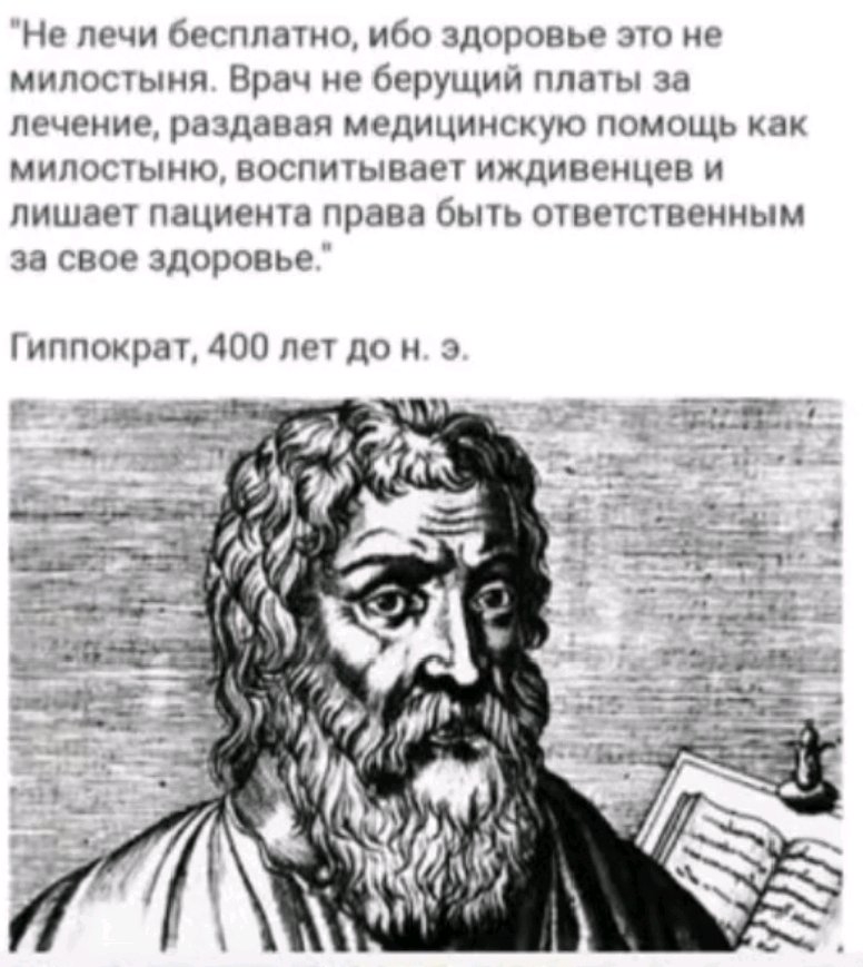 >>6341376 Во-первых, пикрил, во-вторых, клятву Гиппократа в нашей стране не дают, тупая ты жопа. Врачи прошлого всегда подчеркивали, что врач не должен лечить бесплатно, не должен думать о деньгах, чтобы голова его думала о пациенте. Тот же Гиппократ брал деньги всегда, даже с бедных, но не больше того, что те могли дать. Заебали уже нести хуйню про врачей, нашли себе рабов, блять, привыкнув к бесплатной медицине. Еще и кукарекают про совок. При совке ты получал квартиру, нормальную зарплату, достойную пенсию, уважение и почет, а также знал, что завтра, когда ты проснешься, страна будет такой же, как и вчера. Врач должен получать большие деньги либо другие преференции независимо от места, где он работает, и только тогда у нас не будет проблем с кадрами в гос больницах, а не когда их будут гонять по бабкоселам без какой-либо поддержки и время обучения которых достигнет 11 лет нахуй с этими отработками.