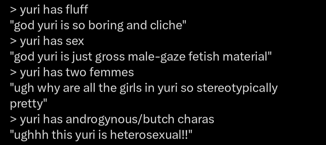 Подытожу че написала: 9/10 юри это кринж и стыдоба про подружбу школьниц, либо фентези. Вообще нет глубины персонажек и каждый раз внутренний конфликт завязан на "ой, а как так, что это за чувство к подруге, мне 15 я не знаю что такой секс ой" Обычных отношачей в жанре кот наплакал. Есть офисное юри, которое спасает, но оно ЛЮТО непопулярно и приходится самой переводить + платно