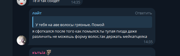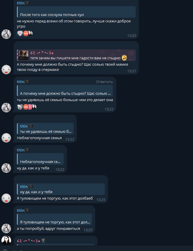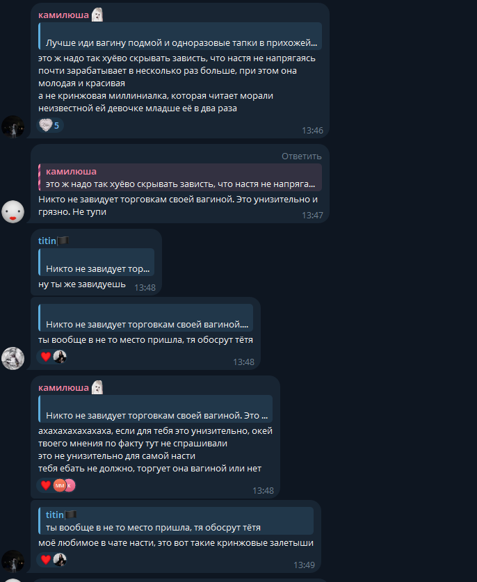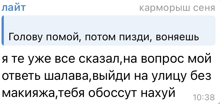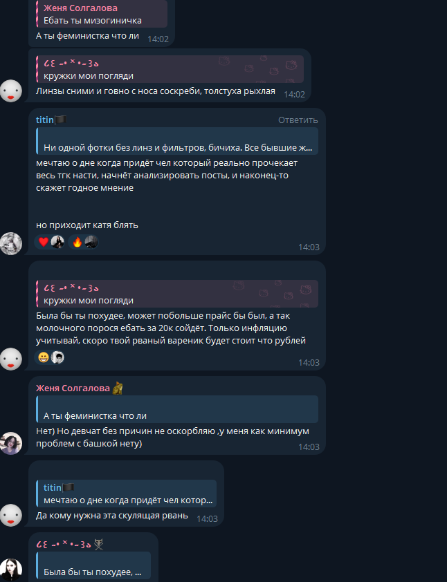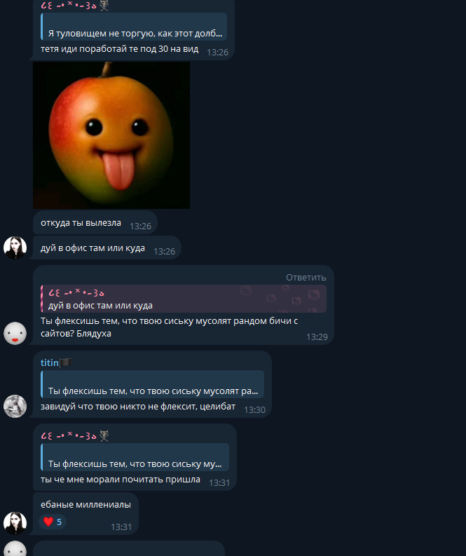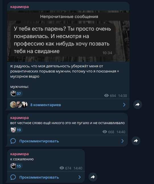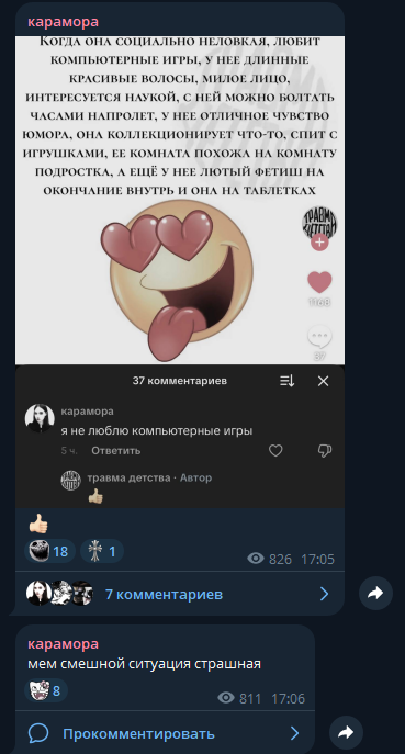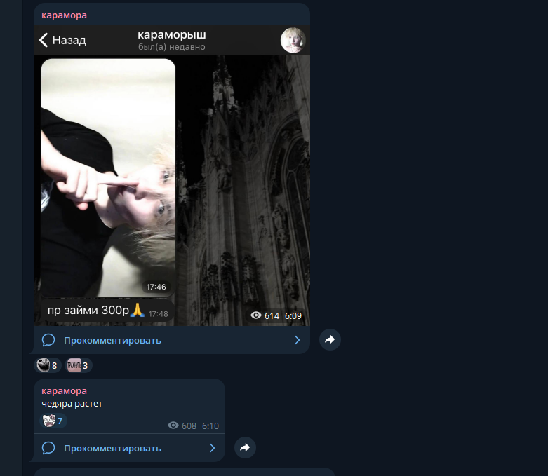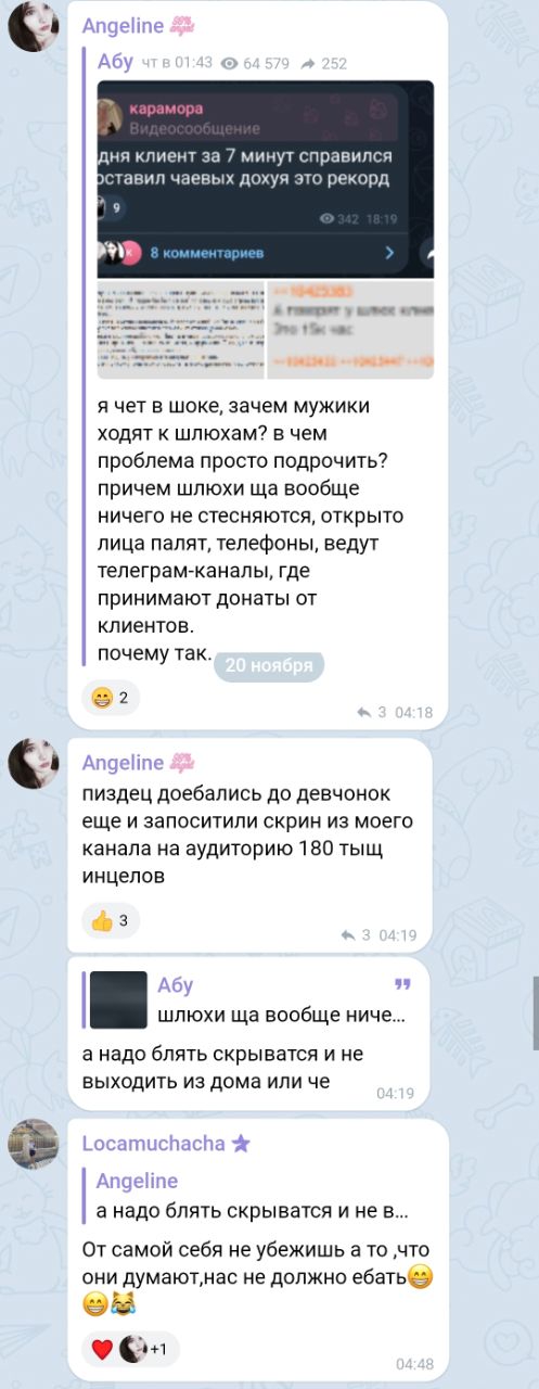 В последнем посте в тг караморы начался сущий кошмар. Пришла базированная тян и стала шеймить за пиздоторговлю. Рой семиклассников во главе с боссом-анимеунитазом ополчились на нее, защищая проституцию (это разве не статья в рф?). Причем пиздят ровно так же, как защитники чмораморы тут: «ты старая/страшная/завидуешь». Долбоебы прям не палятся, что не вылезают отсюда