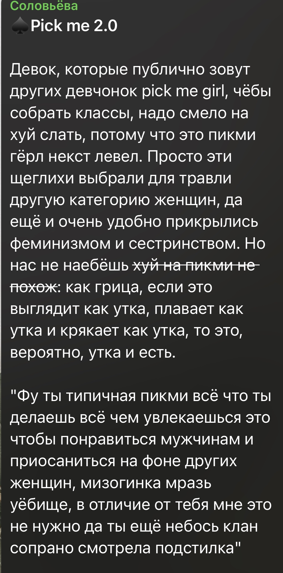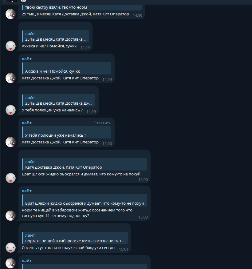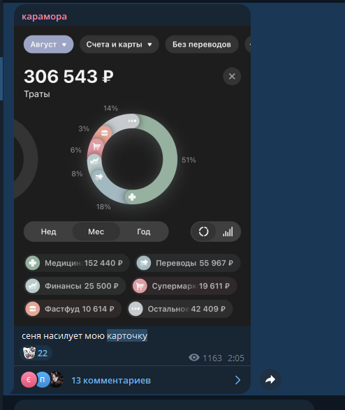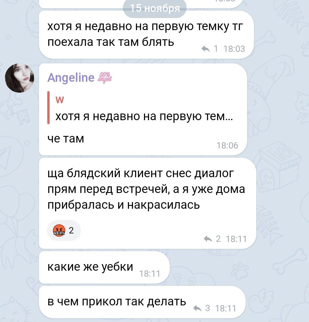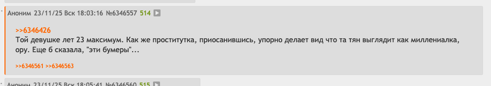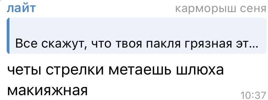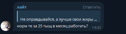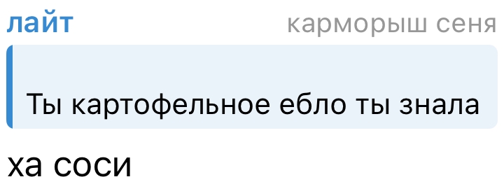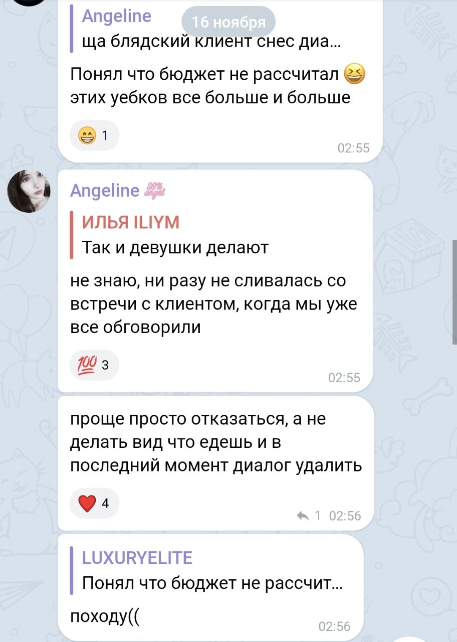 В последнем посте в тг караморы начался сущий кошмар. Пришла базированная тян и стала шеймить за пиздоторговлю. Рой семиклассников во главе с боссом-анимеунитазом ополчились на нее, защищая проституцию (это разве не статья в рф?). Причем пиздят ровно так же, как защитники чмораморы тут: «ты старая/страшная/завидуешь». Долбоебы прям не палятся, что не вылезают отсюда