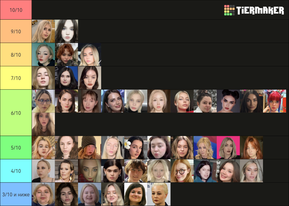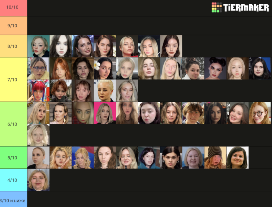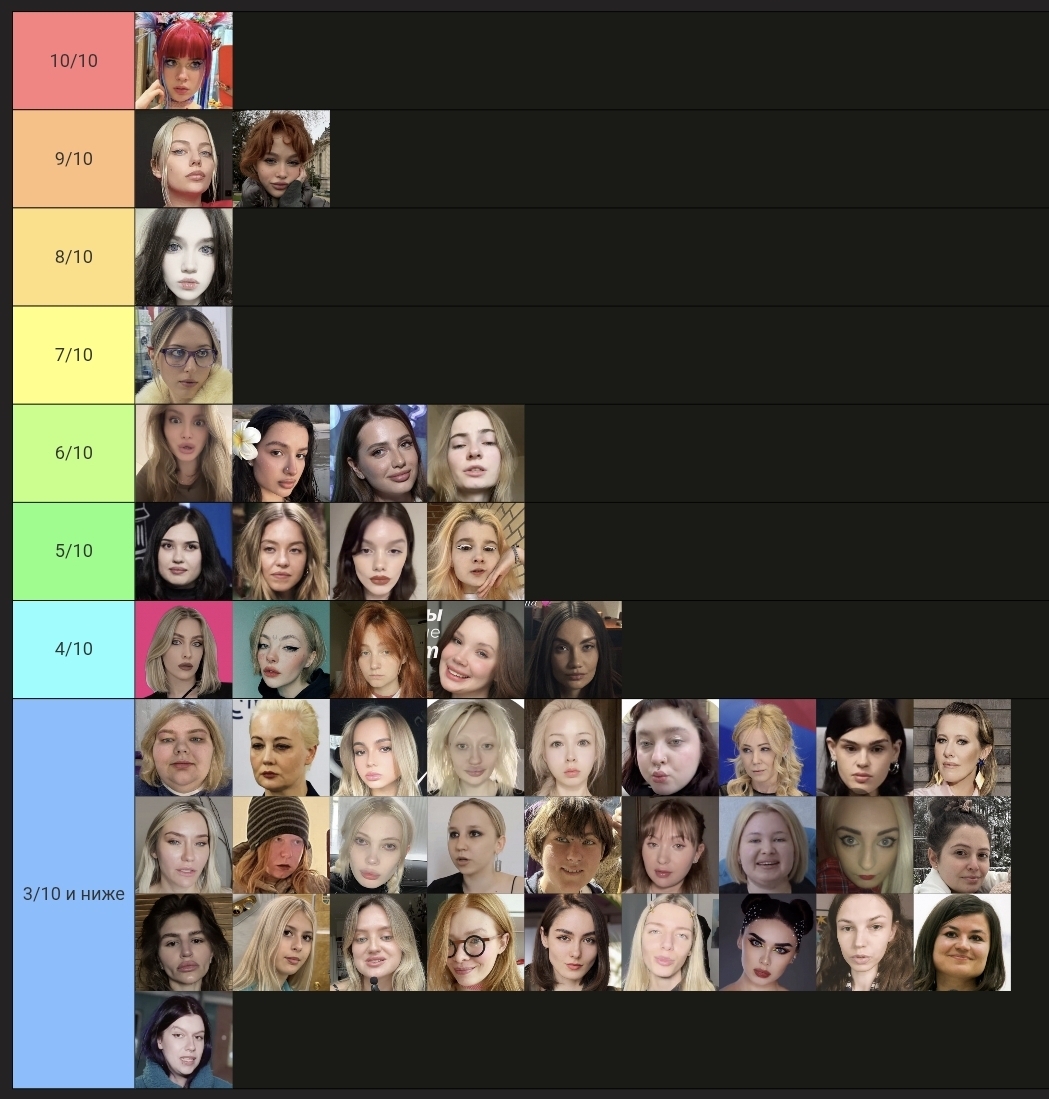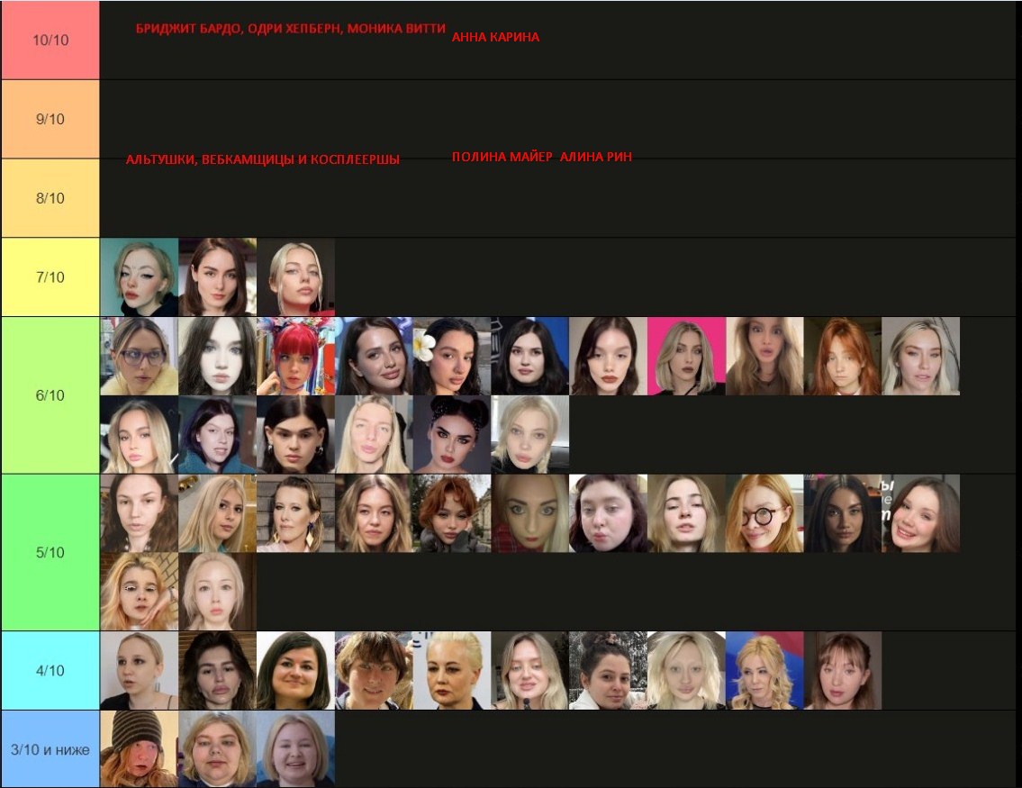 Бл, не успела. Но ладно. Попробую, попытаюсь объяснить. Для кого-то это возможно будет оправданием. Половину из этих девушек я не знаю, могу судить только по фото, что были представлены. Выбирала субъективно, просто по своим каким-то предпочтениям. Капланиху я не уважаю, как человека, и никогда не интересовалась ею, кекала только со срачей, которые были с ней связаны. Но её внешка мне +- нравится. Дроча на Кищук я не понимаю, в целом, она внешне как-то меня отталкивает. Фанаткой Клэп никогда не была, да и вообще её никогда не смотрела, но в целом, как по мне, черты лица у неё гармоничные. Про всех остальных хз, что сказать. ИМХО