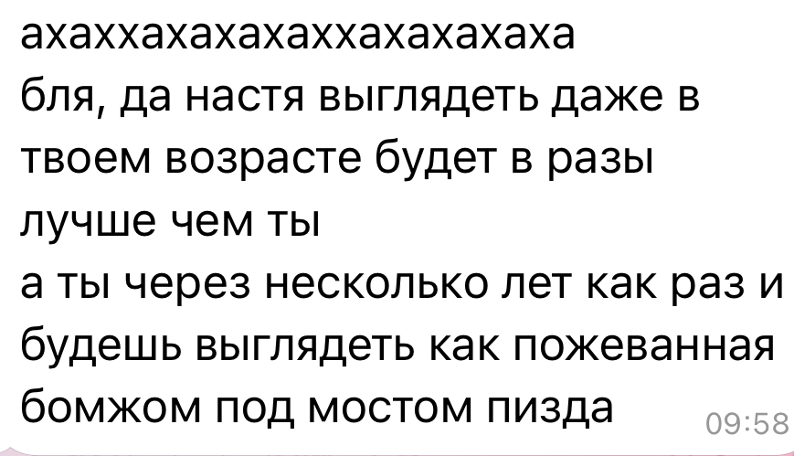 >>6346459 Мне например похуй на ее проституцию, я вообще ее пару тредов назад защищала и писала про завистниц, но после этих высеров эту блядоту мизогинную возрастошизу надо гасить и вообще травить нахуй, слить двачерам чтоб те устроили тгавлю шлхи