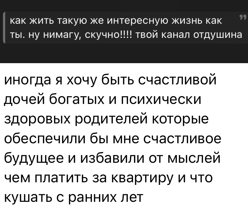 >>6347339 А у меня мать вообще ненавидит все эти репосты и сборы на храмы и больных детей, а я почему-то всегда хотела чтобы мама донатила нуждающимся… просто детская мечта, даже не знаю как сформировалась