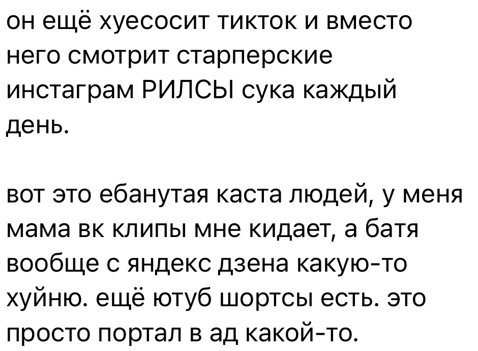 >>6347417 Охуеть проблемы. Слышали? Батя смотрит рилсы, а мамка присылает вк клипы? Тут половина тянача сирот сидят, а она жалуется, охуевшая. Даже Аня Прядко так не говнилась на родаков. Кстати, надо было Аню Прядко тоже добавить в тирлист тяновых
