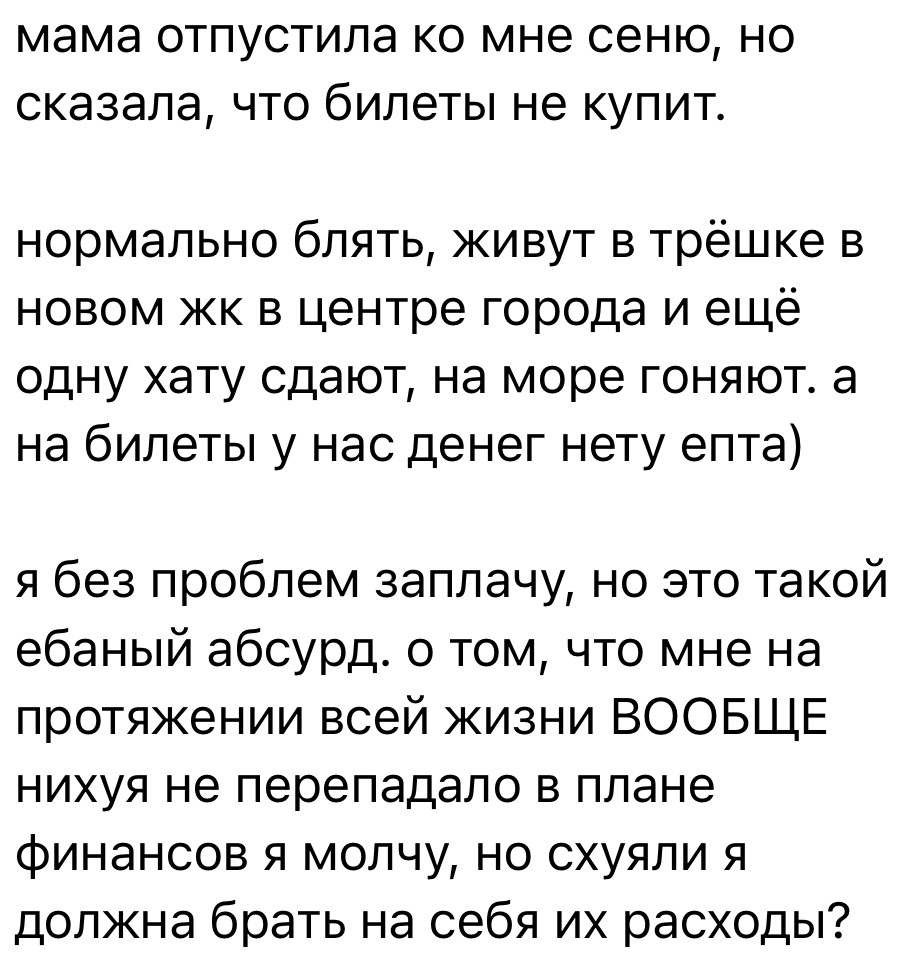 >>6347431 Выше скрин, типа на нее забили хуй. Вот на этого молочного поросенка с фото из детства, которые ее мама бережно и методично выкладывает в вк, чтобы показать гордость и любовь родителя, чтоб ты понимала. Вполне вероятно, что да, могли ездить, и детей оставляли, а карамора из этого сочинила драму для публики а-ля я ела траву меня не любили родители