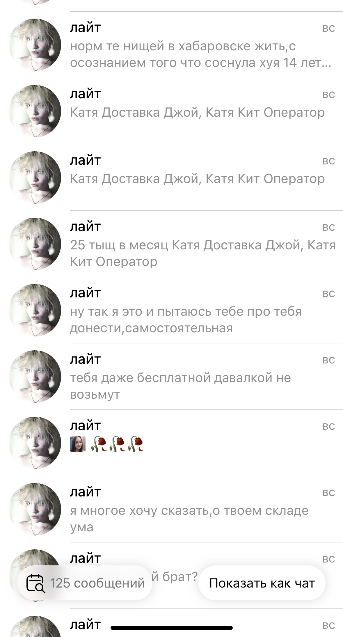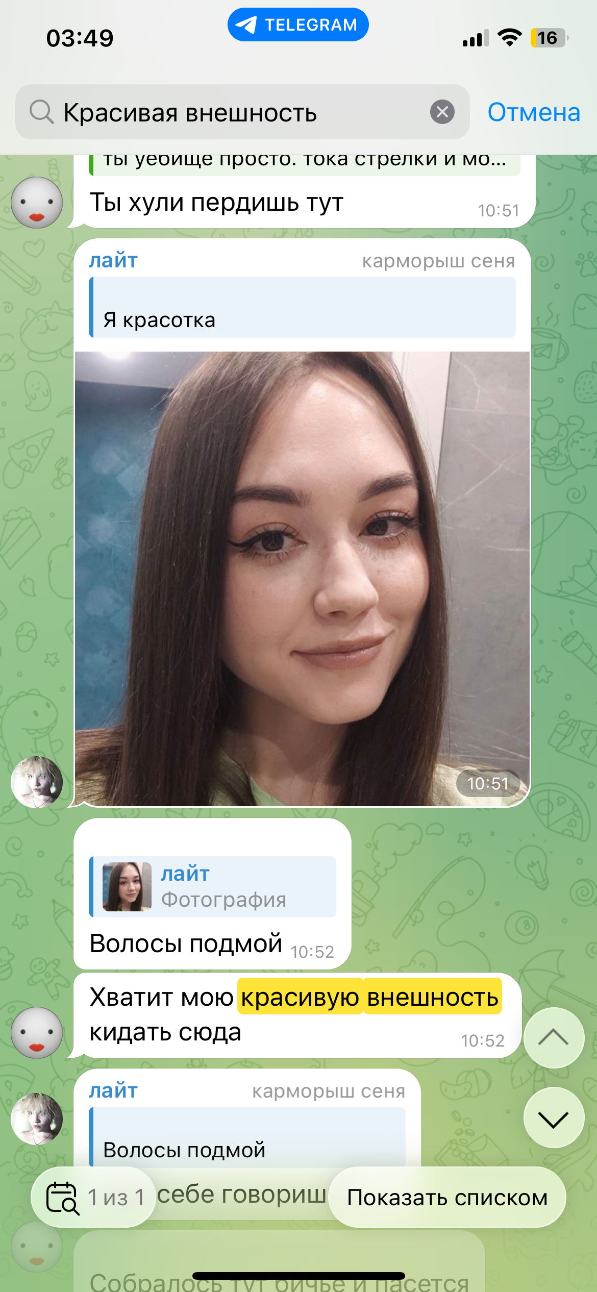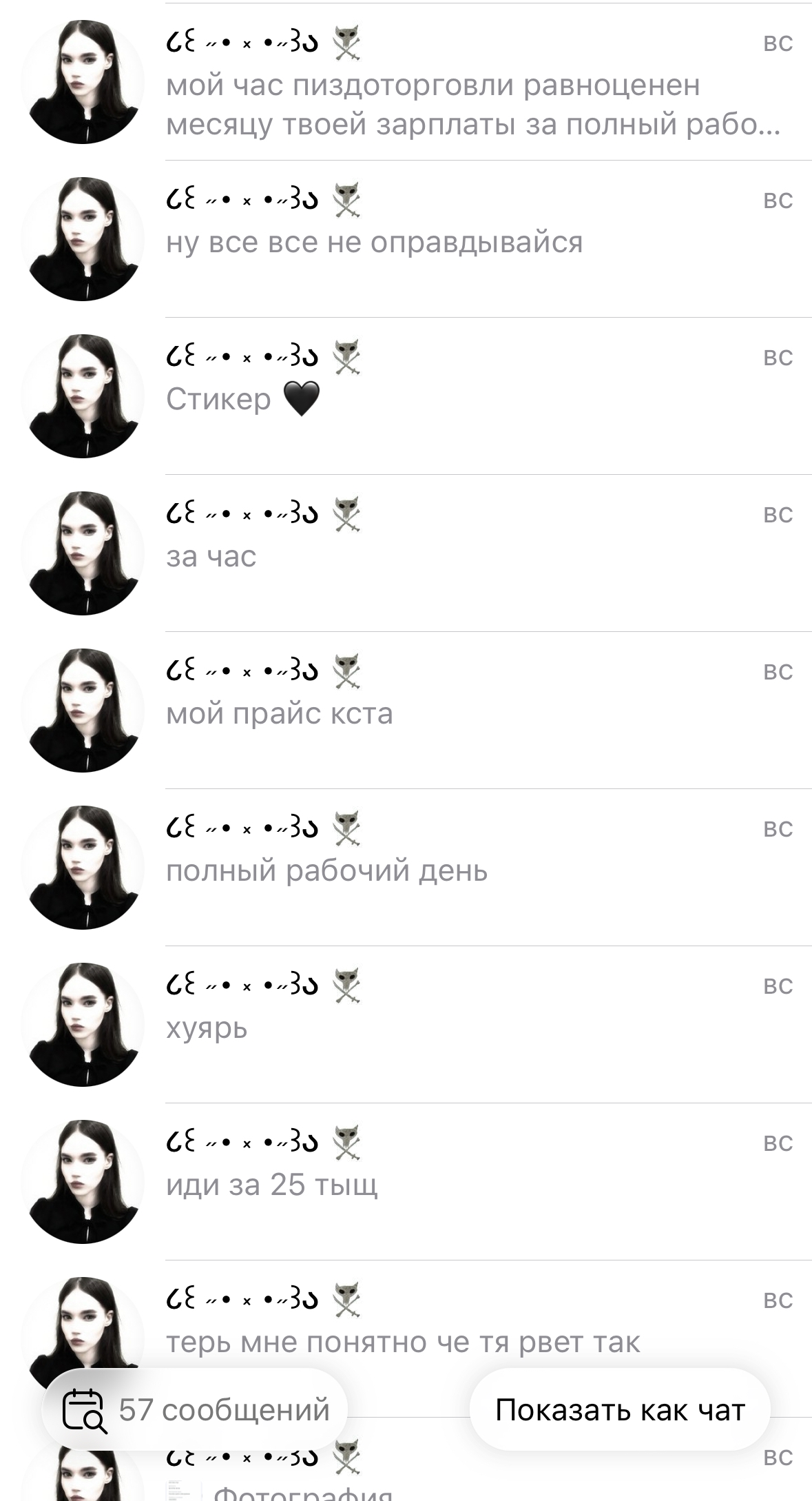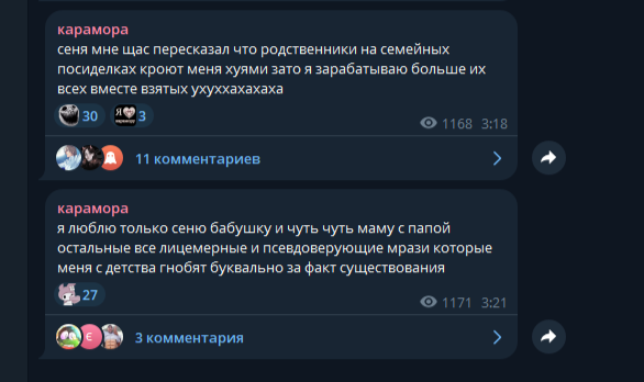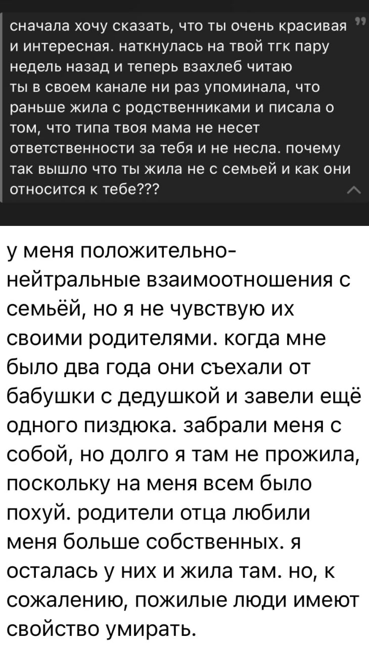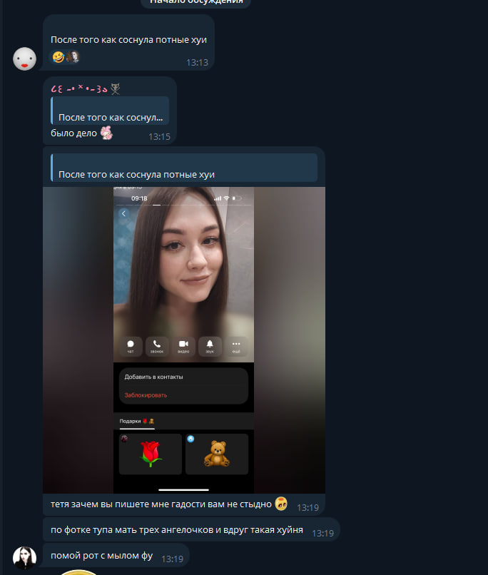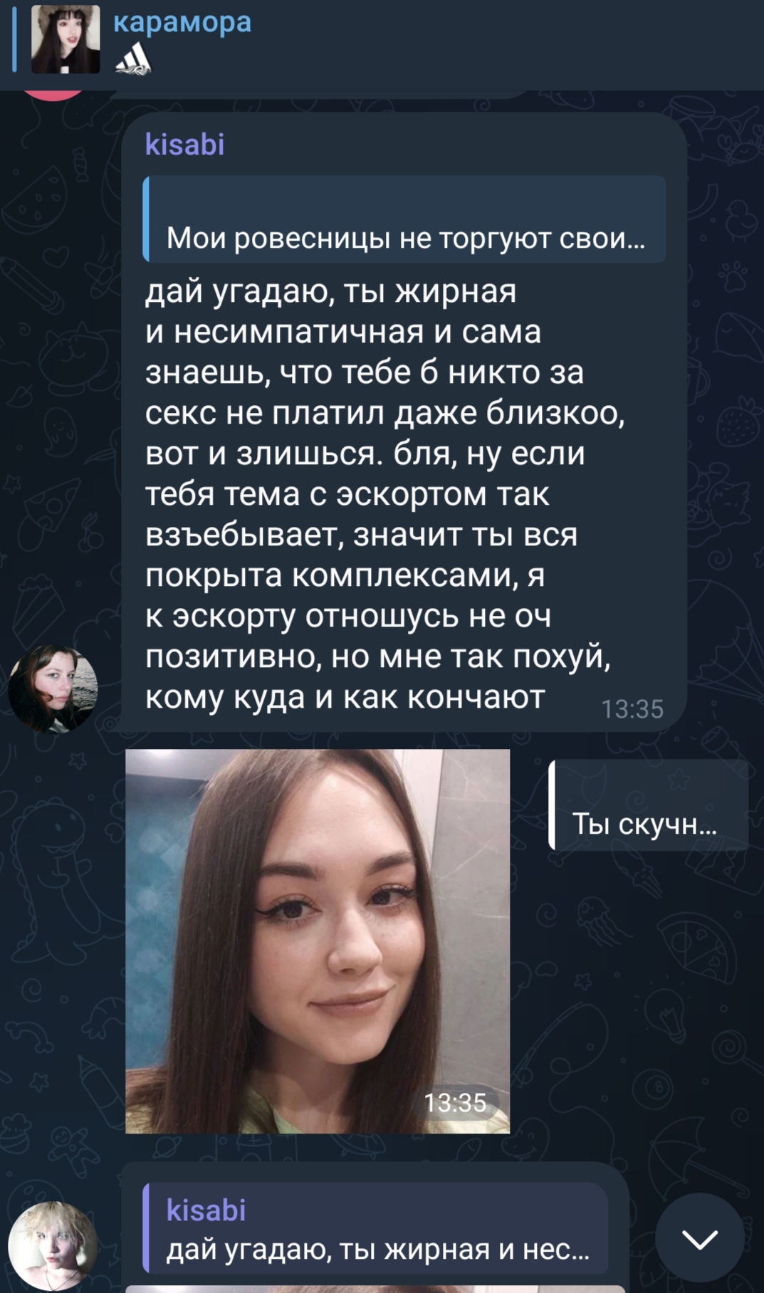 Как я заебалась читать слив этой рандомной тни. То что она занимается эскортом это печально и опасно, чего карамора не понимает из-за возраста. Но это не повод для травли.
