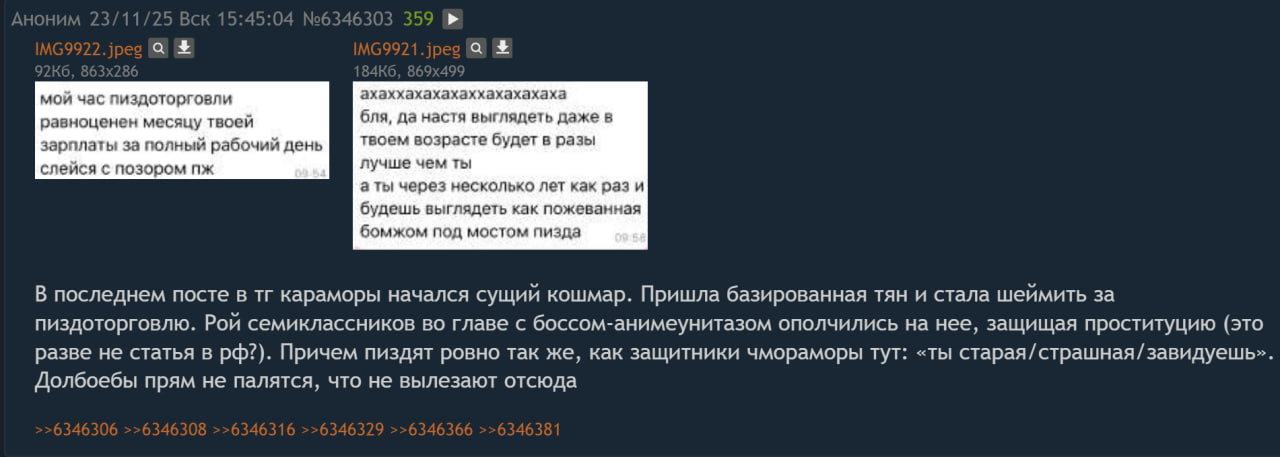 >>6348122 Сейм, не поддерживаю хейта за проституцию, тк только бедобашковые тян туда лезут. Но карамора реально тупая мизогиничка и просто себе в штаны срет этими оскорблениями, она ж доживет до этого возраста или реально пойдет ркниться