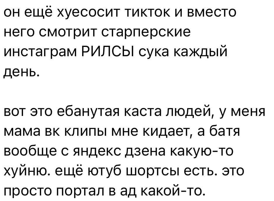 Кстати, я не от одной тянки слышала, как они охуеаали, когда находили странички отцов. Там всегда минимум такое бумерское палево с подписками на члюхопаблики или какая-то кринжанина с творчеством, всратыми фотками. Бумерв вообще ебанутые в этом плане