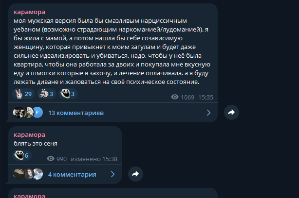 >>6347677 вообще, карамориха мне попалась в реках тт когда то, потом я наглянула в ее тгк и ахуела с того, что тян светя лицом рассказывает не стесняясь о способе заработка своем, будто гордится этим и ее малолетние хомяки подхватывают и поддерживают эту тему, шутят, как то аккуратно спрашивают советы вката и я начала носить ее сюда