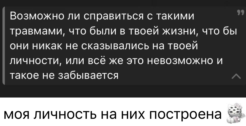 вообще, у меня к караморышу есть жалость и какие-то материнские чувства. малолетняя дура, у которой не было поддерживающего/строгого взрослого или хотя бы близкого друга. психика у неё знатно разъёбана и активно пребывает в этом процессе. искренне желаю ей пофиксить башку. интересно, конечно, что будет с человеком года через три...