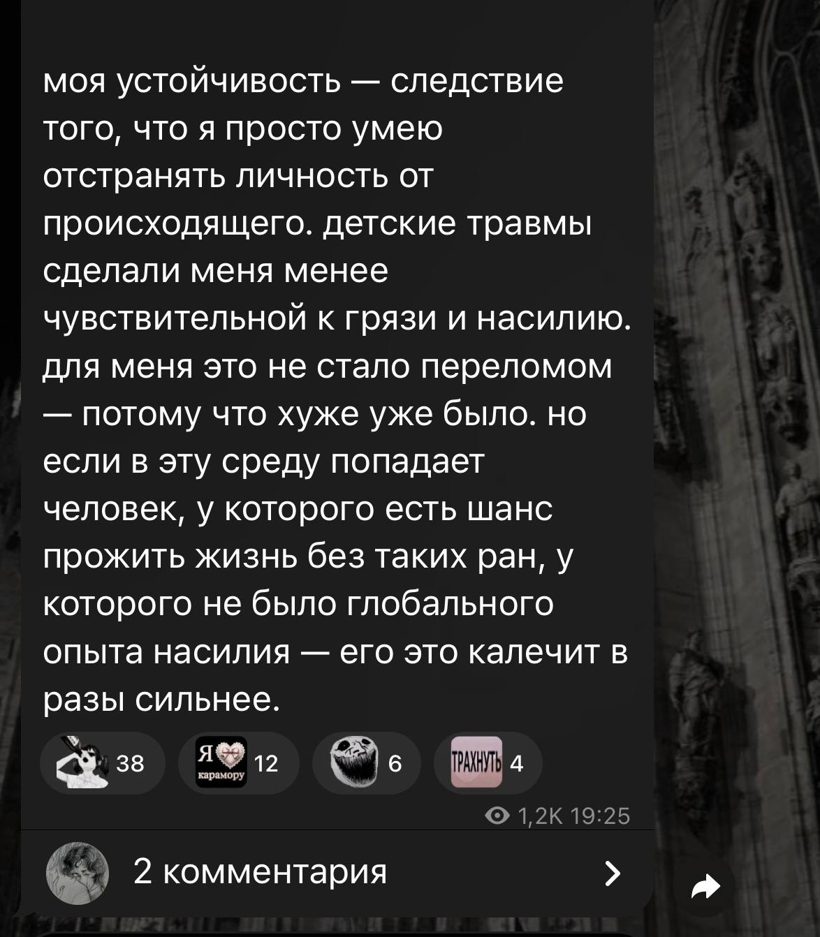 >>6351972 Есть такое, но и пупуню мать понять можно. 3 пиздюка, так ещё и наверняка работа, которую караморыш презирает. Ещё хуй знает отец был вовлечён в семью или поэзию. Бабку с дедом любила, видимо было хорошо, хоть маму с папой не заменит офк. Но как будто из того, что могли ей дали. Ну это чисто серая мораль. Да, ее спихнули, но и маргинальщины из мужского/женского не было (хотя описывалось именно так). Мама хотя бы не пытается в «ничего не было, ничего не помню», искренне переживает. Думаю, у неё сейчас та самая эра, которую каждый пиздюк проживает, когда понимаешь, что тебе родители чего-то недодали и смиряешься.