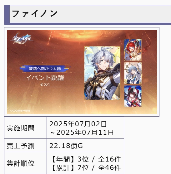 >>6352458 К фаэнону записали половину с коллаба фейта. Этот сайт всегда так делает, если два баннера в одно время - прибыль между ними делится. Фаэнон вышел, постепенно стал падать по продажам, но когда вышла коллаба с фейта и хср опять на 1ое место взлетел, фэенону опять стали записывать много. То есть за 1ое место обычно дают 6g и в первые дни Фаэнону так давали, а вот когда фейт вышли, то их баннеру только 3g давали за 1ое место, а другие 3g стали отдавать Фаэнону. Так что на японскую стату особо не стоит смотреть.