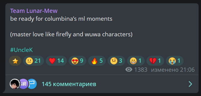 >>6363782 Поверь, коломбайн в сотню раз более невыносимая, чем любой вайфукал из натлана. Что же до кирюхи, то он, на мой вкус, вышел пока самым унылым персонажем всего каста нод края. Просто очередной дед в новой шубе.