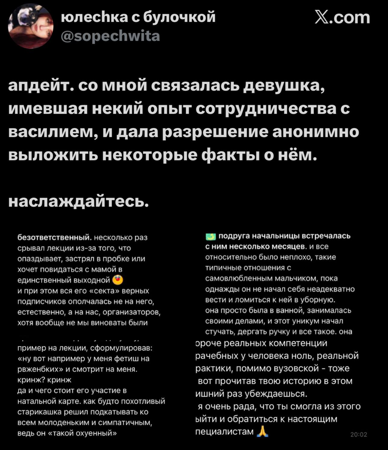 >>6363925 >>6363972 Ставлю на то, что она дико закомплексованная, возможно, даже травимая в шкалке или типа того. Поэтому питается всякими огрызками внимания. Сомневаюсь, что Росов это говорил всерьез, хоть и нет никакого желания защищать ее.