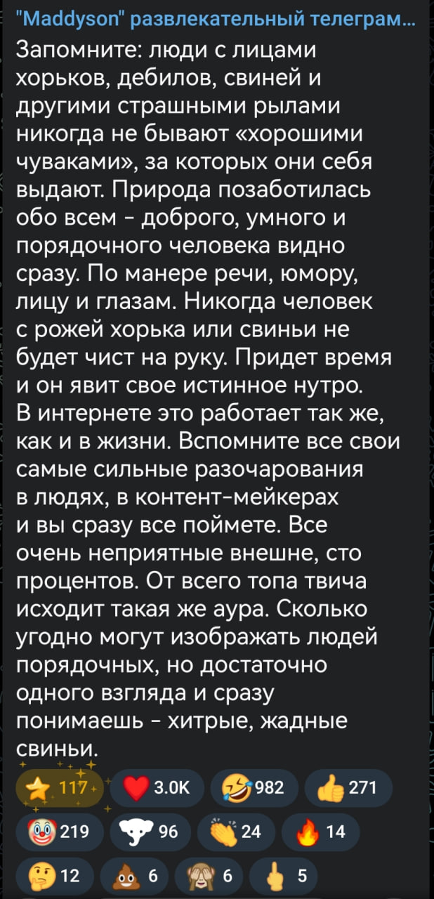 >>6367041 >что сами иерархичные Вот прям база. У них есть еще зашкварные действия, которые могут понизить их в иерархии, на которые надо обязательно ответить. Например если кто то сказал мужчине "я твою маму е" он обязан ответить либо будет терпилой и опустится в иерархии. Или вот еще, недавно на стриме одном сидела, чувак приехал в гости к кенту и попросил на стриме ему кофе сделать, а тот отказался ибо он не шестерка, то есть у них в иерархии зашквар сделать кофе другу если он попросил, типа ты бегунком становишься и шестеркой. Про их "крепкую" дружбу вообще молчу, все медийные уже разосрались по сто раз. Клоуны