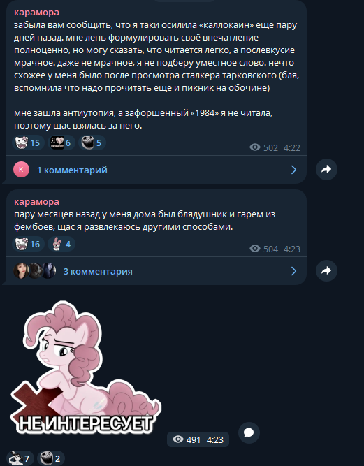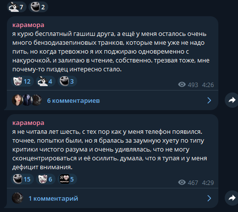 чет вспомнила двух деятельниц косплея, которых точно где-то здесь обсуждали, но я не могу вспомнить имен. мб кто-то поймет о ком я первую звали амелия или офелия, была вся больная, называла голые фотки искусством и иногда постила свою дочь, у нее имя тоже какое-то было необычное. еще рассказывала как ее не любила мать и вроде про хуевых родителей своего мужа вторая просто косплеерша, училась на швею вроде, работала на складе вб и ныла что нет денег. потом помню она каналы чистила и удаляла, тк всплыла запись вебкам стрима ее подруги, где она тоже была мне ж не могли такие персонажи присниться???