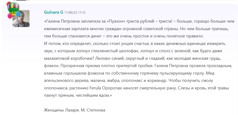 Блин, купила этот парфюм и расстроилась. Увидела отзыв одной тян в тг, она написала: "вахтёрша на работе сказала, что они с охранницей балдеют от моего парфюма… девочки я плачу" Меня это забайтило заказать, лол Короче, я оплатила 10к и они пришли под новый год, но мне вообще не понравились, решила их маме отдать