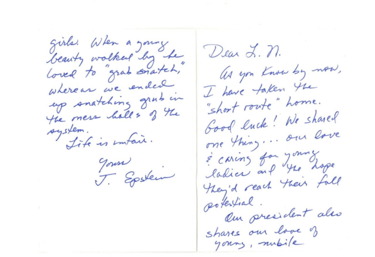 В этом письме Эпштейн сообщает две важные детали. Он подтверждает, что собирается покончить с собой, а также утверждает, что президент Дональд Трамп разделяет их любовь к «юным, созревшим девушкам».