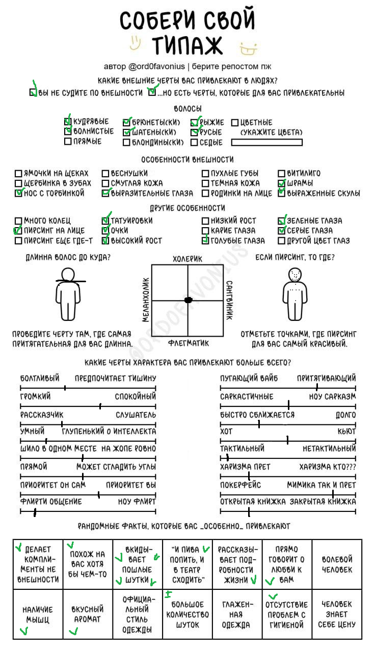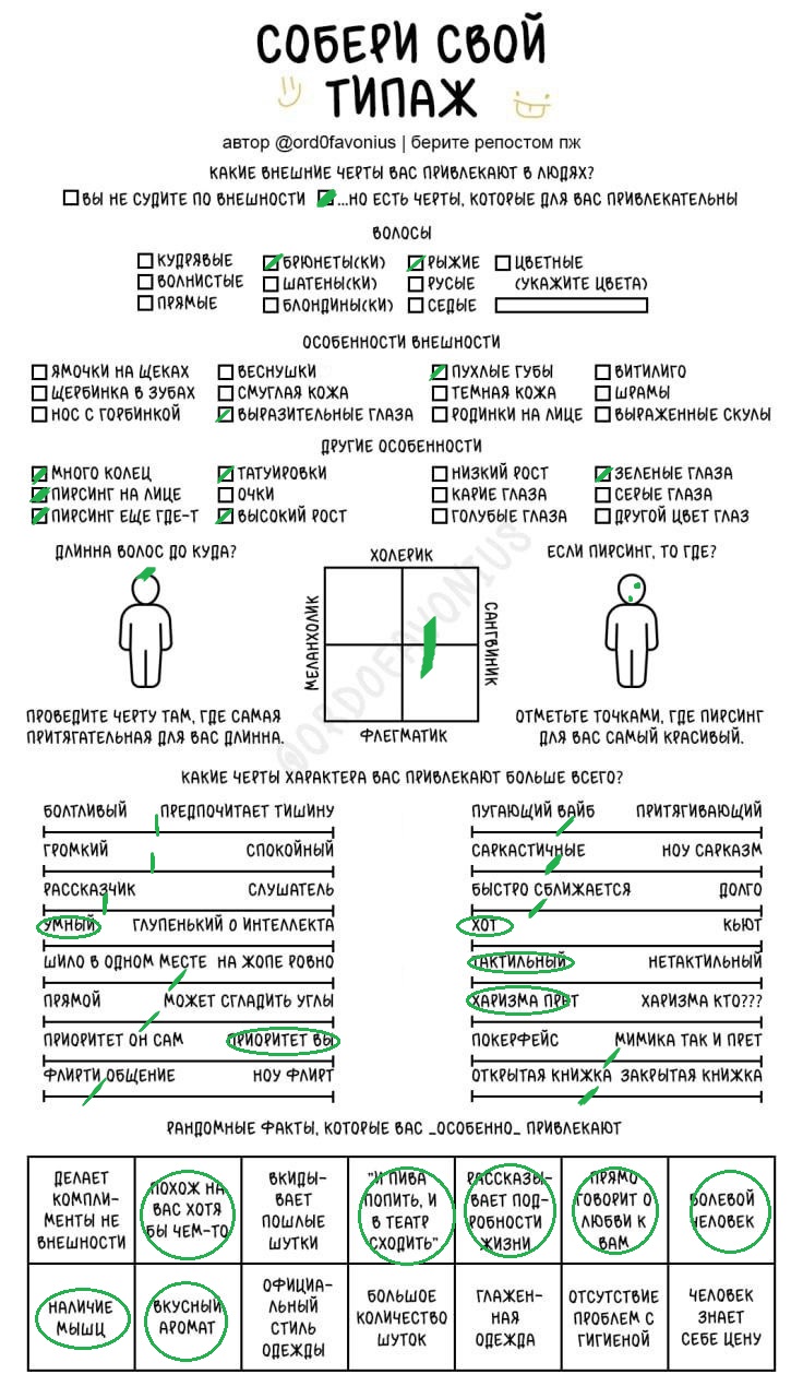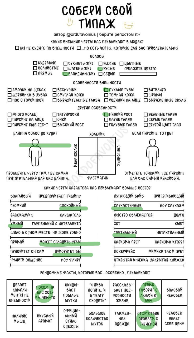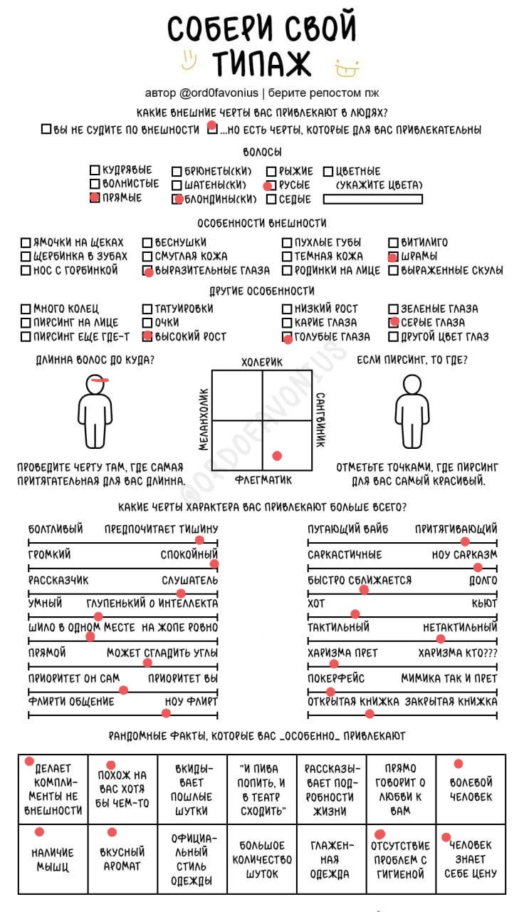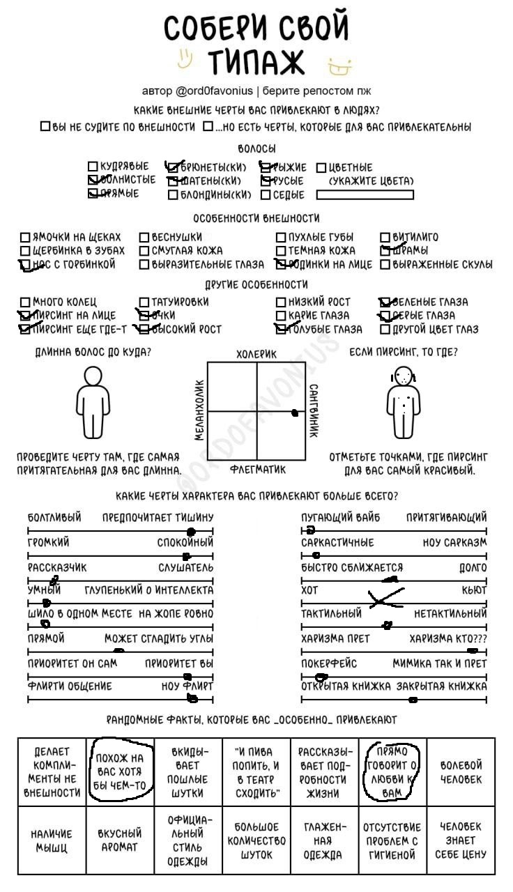 Мда, я думала это про девушек, а оказалось про чуханов. Первые пункты про родинки-пирсинг--щербинку-ямочки на щеках это прям дефолт предпочтения нетакусь любительниц нетипичной красоты.