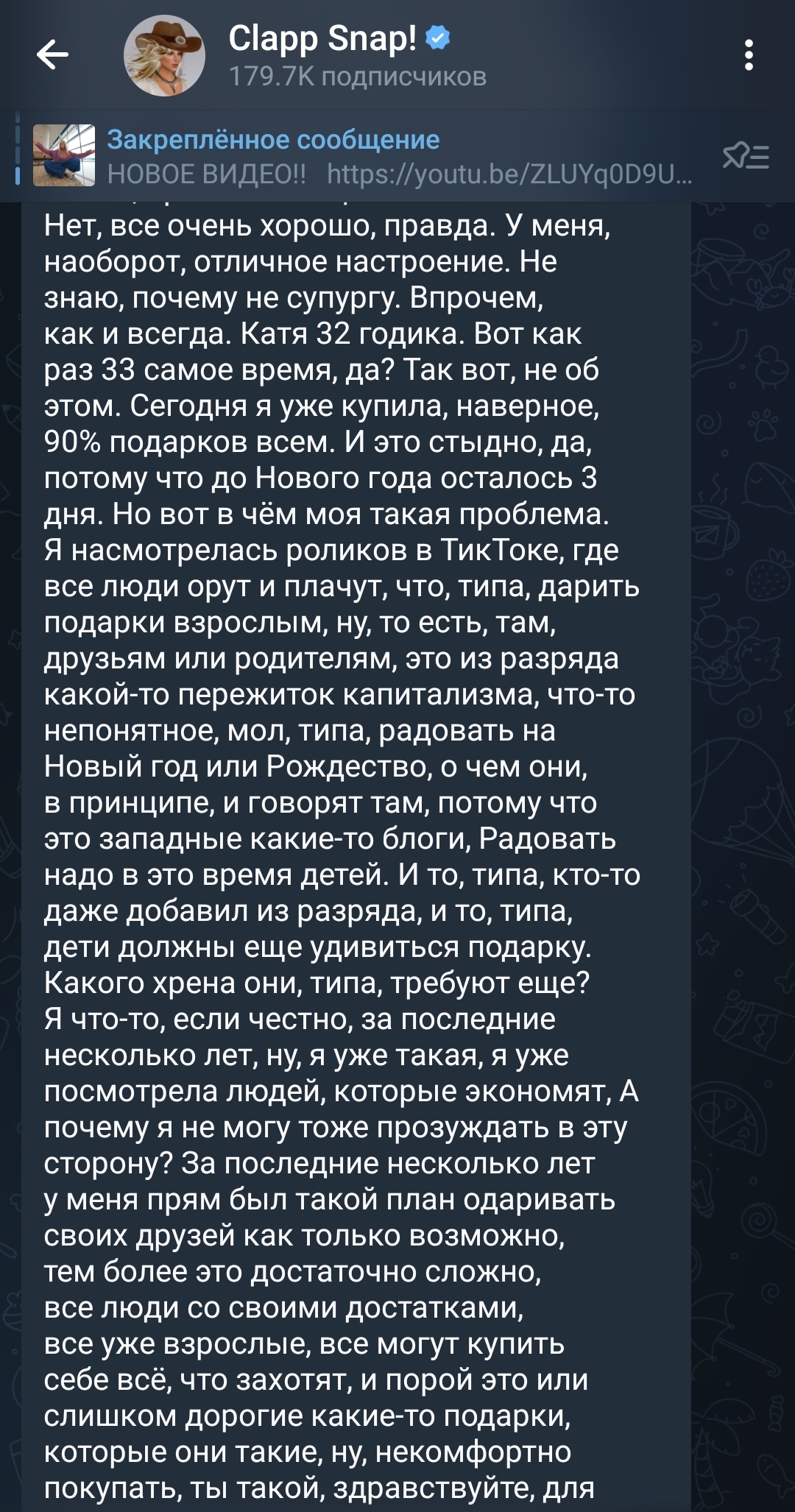 >>6380002 >Мне ни то ни то не дарили лол, ну телефон дарили Мне дарили подарки до 300к суммарно, так скажем. Но я изначально жестко фильтрую по жадности. Я сама анальница, мне сверху этого не надо.