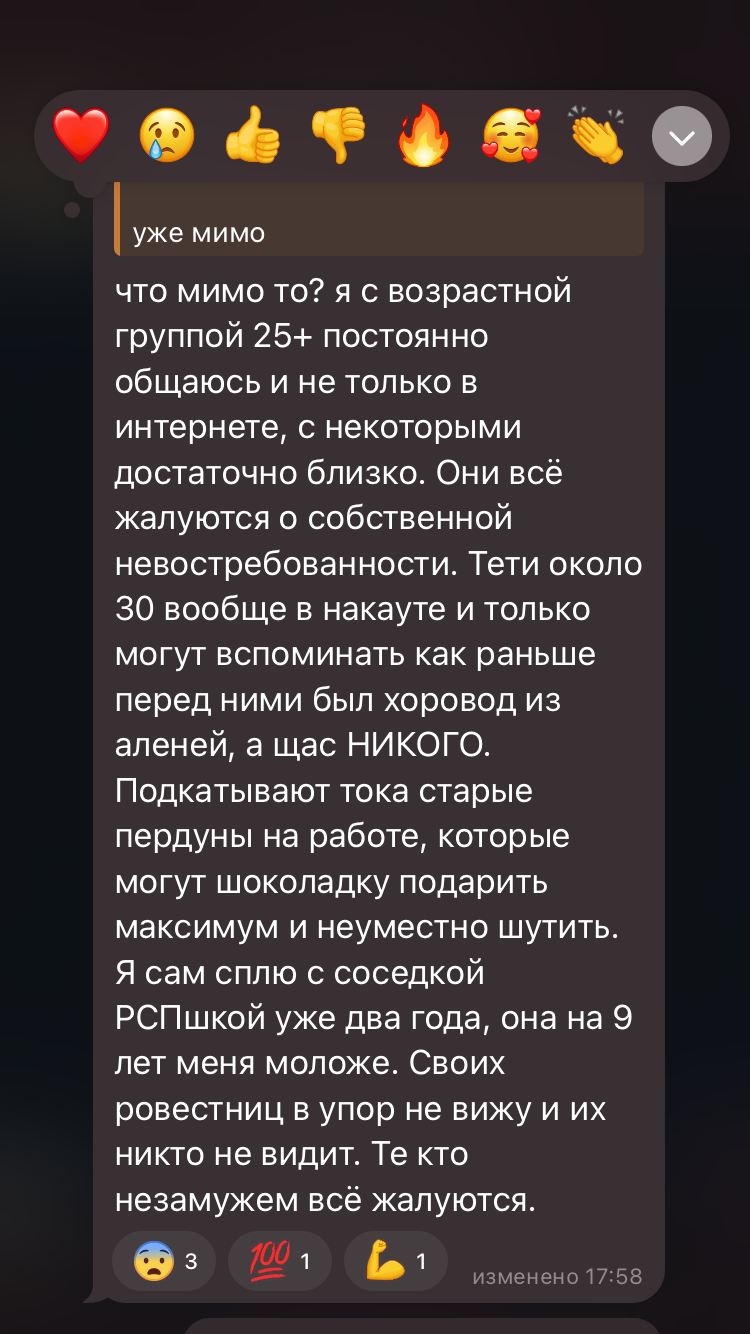 Так это база. Они буквально ради этого жрут гормоны, чтобы стать тяночкой и залутать все привилегии. В их манявселенной они не додики, а просто женщины внутри, поэтому и не могут нести традиционную мужскую роль. Зато традиционную женскую из прона - да.