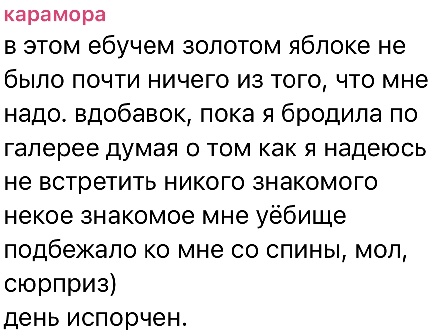>>6394531 ++, реально, она же сама предложила мне съебаться чисто из-за его отношения ко мне. офк она бы по итогу ему не дала, она "хранила" себя до того самого единственного, но тем не менее, это ебаное отношение ко мне отбило у неё вообще всякий интерес к этому человеку, даже меркантильный тарелочный "бесплатно пивка попить"
