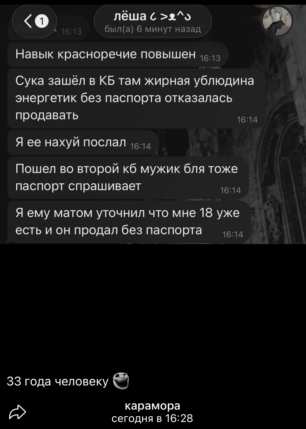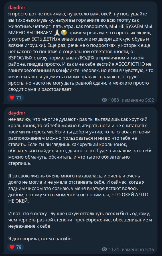 >>6393880 моя история: уважаемый чел в определённых кругах моего города позвал мою подружку 1 мая попить пивка с его друзьями в его компании. она позвала меня: ей было страшно одной. хоть это было на улице на проходном месте, но тем не менее ей он дал бутылку пива, она попила немного, начала протягивать мне, он говорит: "это ей, а не тебе, я тебя ваще сюда не звал" и было много с его стороны подобного. она красивая, её обхаживал, а я не такая красивая, на меня хуй не стоит, со мной можно как с мусором общаться даже не скрывая этого короче через пару часов подруга сама предложила мне съебаться, ей было приятно его "ухаживания", но она также видела что ко мне абсолютно уёбищное отношение было, и поставила меня в приоритет он потом узнал что ей не было 18 и перестал написывать и звать куда-то (удивительно нахуй что это стало для него причиной не писал, я думала ему будет похуй и даже прикольно что "малолетка"). но мы к этому моменту уже и не хотели в этом круге вообще быть - если их "лидер" такое неприкрытое мерзотное быдло, то нам такого не нужно. да и в первую очередь она пошла потому что бесплатное пивко обещали лол, нежели чем круг этот нам был пиздец интересен и важен было супер обидно мне конечно пиздец. такая агрессия в мою сторону просто потому что всратка по сравнению с ней....
