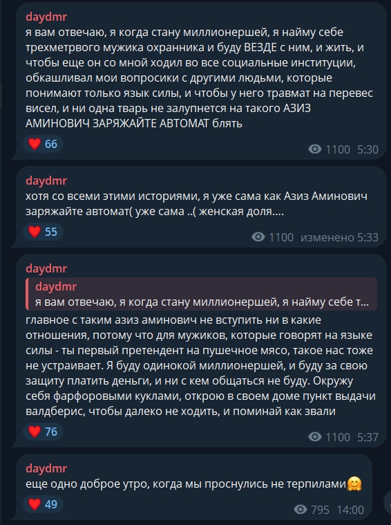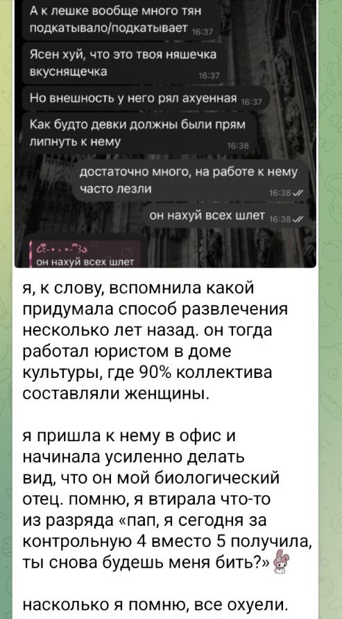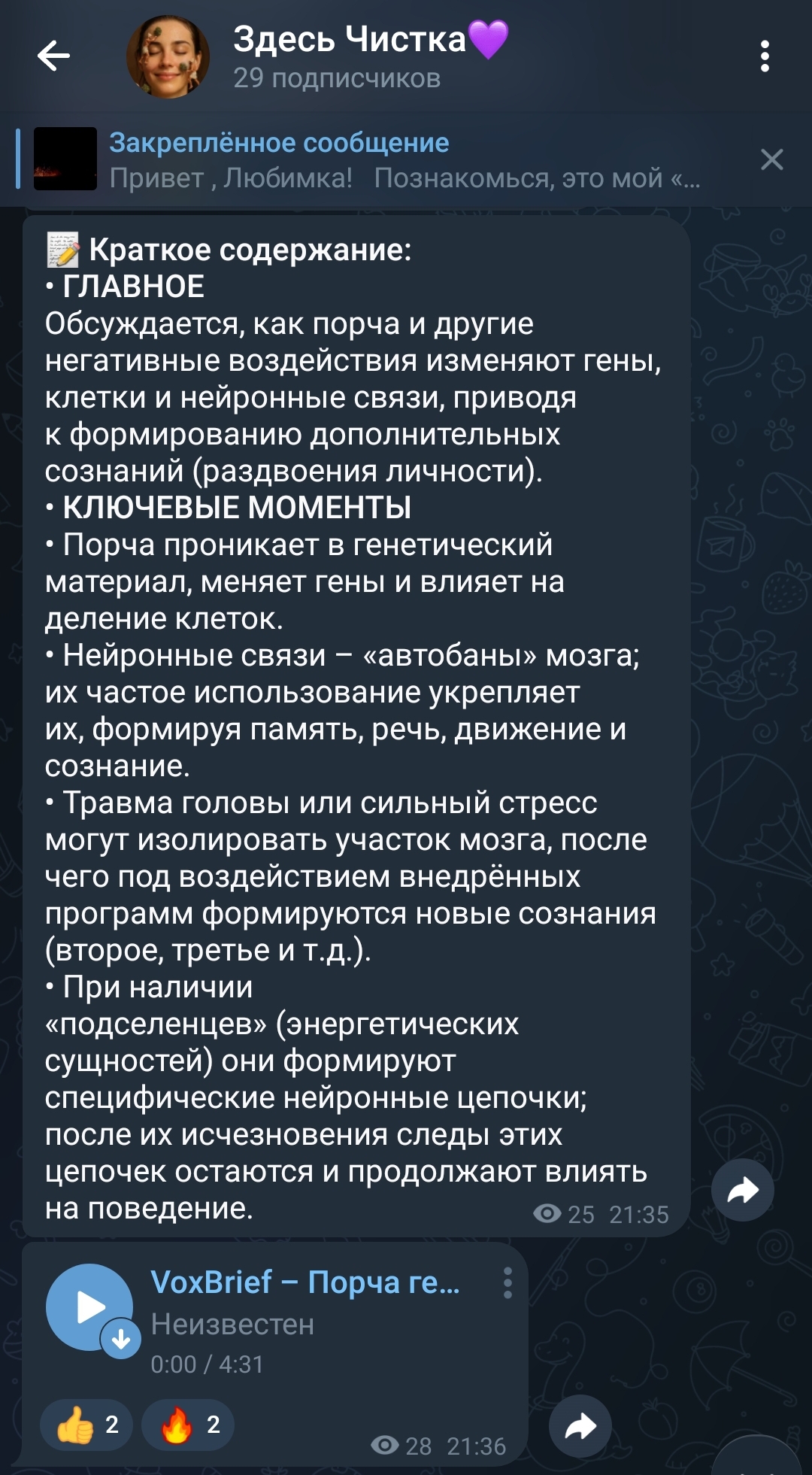 Нашла телегу Алевтины. Раньше она активно вела тгк и там не было шизы такого "духовного" рода. Щас тгк не ведёт, но активно выкладывает истории о каких-то шизо чистках, и я когда такое вижу, то ахуеваю, это же какая-то секта или сборище шизов натуральное. Чё с ней случилось, как она с секси кружочков стала вести канал про шизу > порча проникает в генетический материал, меняет гены и влияет на деление клеток Это ваще чё за хуйня