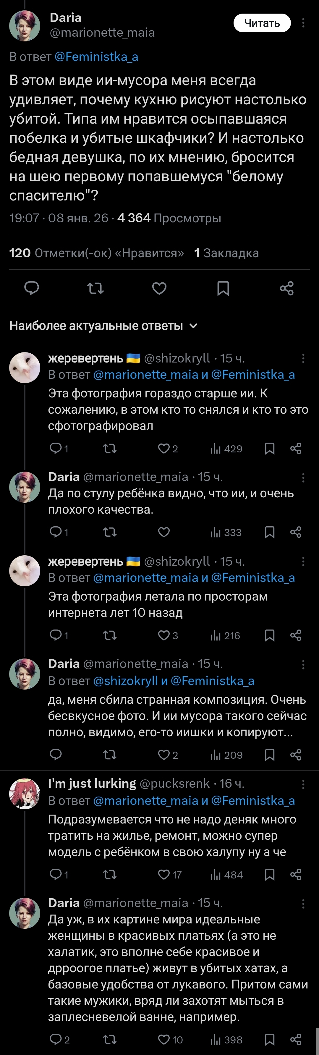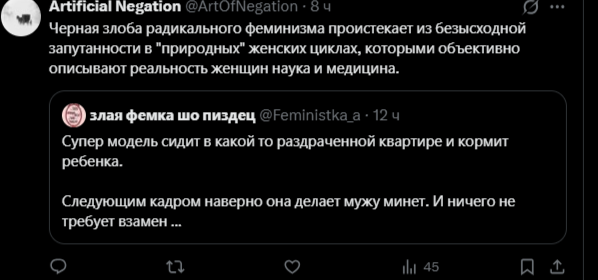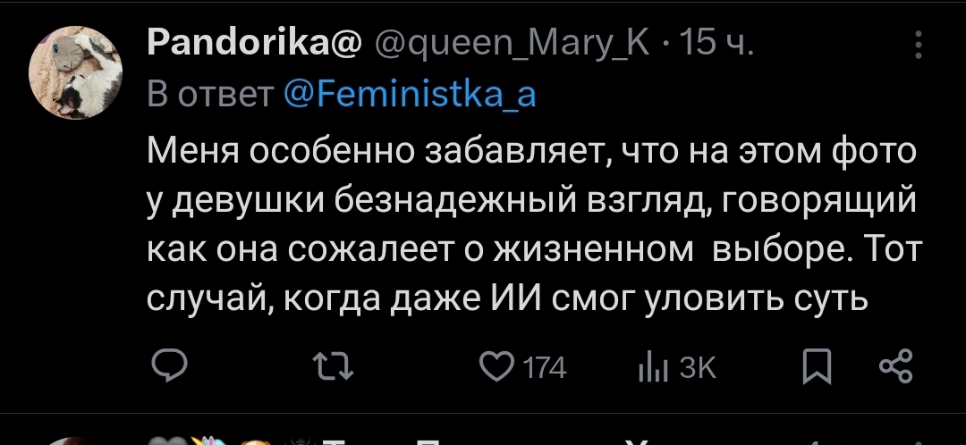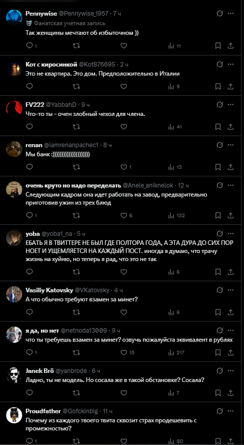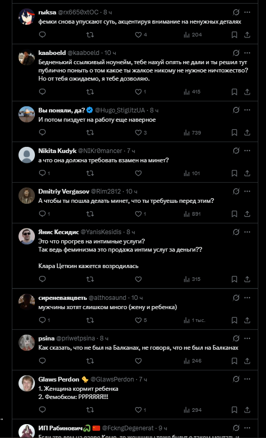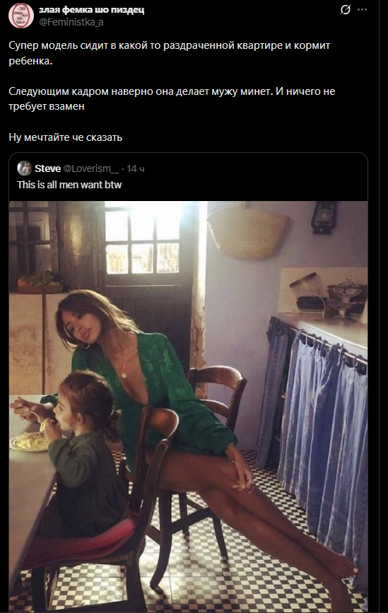>>6395598 А я не воспринимаю всерьез фемок из категории «мамка-одиночка + обиженная бывшая жена». Это та категория фемок, которые «до первого нормального мужика», как бы мизогинно и цинично это не звучало, но это так. Они строчат простыни о том, какие нынче безответственные мужики (так-то оно так, вопрос, зачем было рожать от такого) в надежде, что найдется кто-то среди подписчиков нитакой и придет и возьмет на содержание с пиздюком. Одна, кстати, в этом напрямую признавалась, зап зап, может, кто помнит. Вообще у таких фемок нет никакой политической сознательности, позиции, понимания хоть какого-то. Единственная проблема, которая их волнует, это то, что муж оказался недостаточно надежным и вовлеченным отцом. Получается, чтобы решить эту проблему, надо просто найти более надежного и вовлеченного самца (или того, кто им прикидывается). Если задача выполнена, фем-активизм заканчивается. Вот пример, Юлия демакова, создательница паблика щастье материнства. Ух, какие она проникновенные посты писала, «не обижайте матерей»! А когда началась война, из неё полилось говно литералли на уровне соловьевщины. Что-то матерей с детьми по ту стороны ей было совершенно не жалко. Так что такие фемки у меня вызывают вообще ноль солидарности и сочувствия и общности и блабла. Просто тупые бабы, которые расплодились от плохих мужиков и ноют.