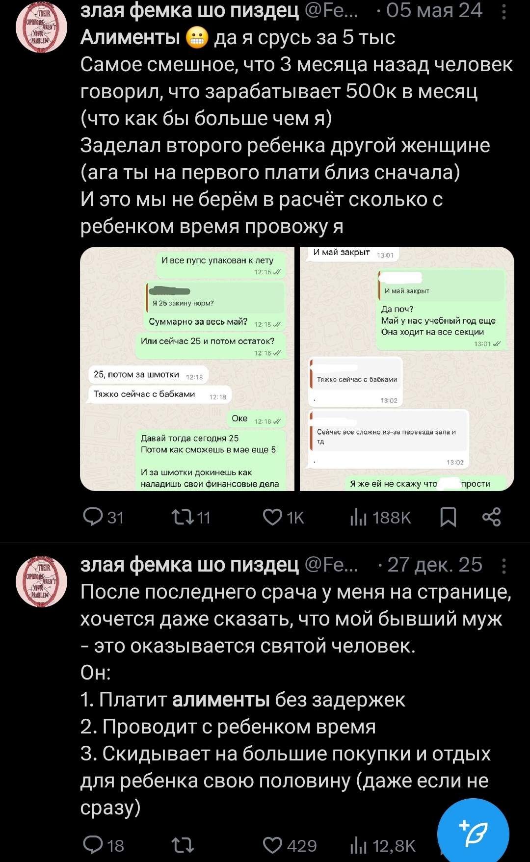 >>6395511 Ой, я когда ещё сидела в твиттере, постоянно видела посты этой «злой фемки». БОльшая часть из её твитов строилась по принципу: «1) оставила дочь с бывшим мужем 2) бывший муж сделал какую-то фигню 3) забрала дочь 4) ну вот и как доверять этим мужикам».