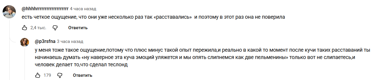 >>6397142 Я послушала этот момент, и я его понимаю У них случилась ссора (не первая), Лиза залезла в его телефон и о господи нашла там в истории поиска порно И вот он он понял, что в этих отношениях ему слишком плохо, душат, надо все время держать ответ и защищать себя и оправдываться, и надо разрывать отношения, пока есть момент. Хз я бы тоже в таком случае хотела бы уехать, а не остаться отмечать - велика бы была вероятность, что все опять бы стерплелось-слюбилось и разрыва отношений не было бы была в похожих отношениях 6 лет, тут главное как с пластырем - резко и больно, иначе это долго и травиатично будет тянуться