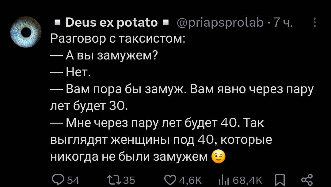 >>6397800 Это правда кстати, тоже заметила, как будто кто в 30+ разведен даже более адекватные чем то кто в 30 даже ни разу не были замужем. Как ни крути но семья это важно, на самом деле ОЧЕНЬ мало людей которым это действительно не нужно и которые могут обойтись без никого и идти по жизни одни. А для большинства людей отсутствие отношений будет давить рано или поздно, общество тоже давит со своими «а у тебя кто нибудь есть?» «а когда замуж?». На фоне этого едет крыша, мне незамужние 30+ попадались максимально странные, озлобленные и завистливые очень