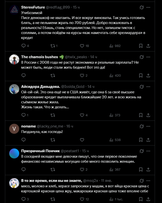 >>6399274 А иы посмотри как средний человек живет. Да бедненько, да блять берут микрозаймы дабы до получки хватало, зумеры вообще и просто так для души брать микрозаймы не брезгуют. Все в долгах как в шелках сидят. Потом идут на сао долги свои гасить а кто то прячется и им карты блочат, наботают неофициально, живут в одной квартире вдесятером, мяса вообще хуй знает когда видели, колбаску берут ливерную на развес полакомиться, а так набор суповой, куриные шейки. А ты сидишь и говоришь как мешает инфляция с зарплатой 300к Это я еще не говорю что сейчас как ни странно с войной лучше жить стали, и в холодильнике прибавилось у людей и в карманах. А они инфояция. Зарплаты и пенсии тоже растут