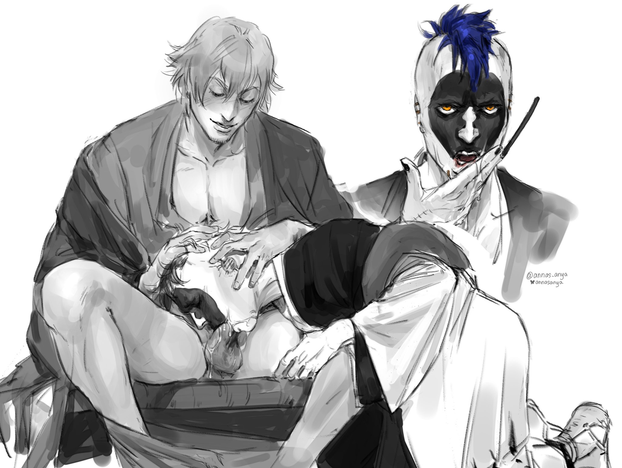 @monkey напиши большой рассказ на 5 минут чтения про любовь саске и наруто пиши красиво и хорошо передай характер персонажей ну можно чтобы там сосали ебали кончали душили хуй вставал в общем ну главное чтоб любовь персонажей передалась понимаешь да психология их любви это очень важно. начни с того что саске пришёл к наруто вечером Вечерний Коноха дышал тишиной, нарушаемой лишь шелестом листьев и далеким лаем собак. Саске Учиха стоял у двери скромного дома Наруто Узумаки, сжимая кулаки в карманах плаща. Он не звал, не предупреждал — просто пришел, как всегда, ведомый той невидимой нитью, что тянула его обратно к этому идиоту после всех побегов, битв и обид. Дверь распахнулась от первого же стука, и Наруто, растрепанный, в растянутой футболке, уставился на него синими глазами, полными той же смеси ярости и тоски. "Саске... ты опять? Вкатишься или так и будешь торчать как скуф на пороге?" — буркнул он, но отступил, впуская.