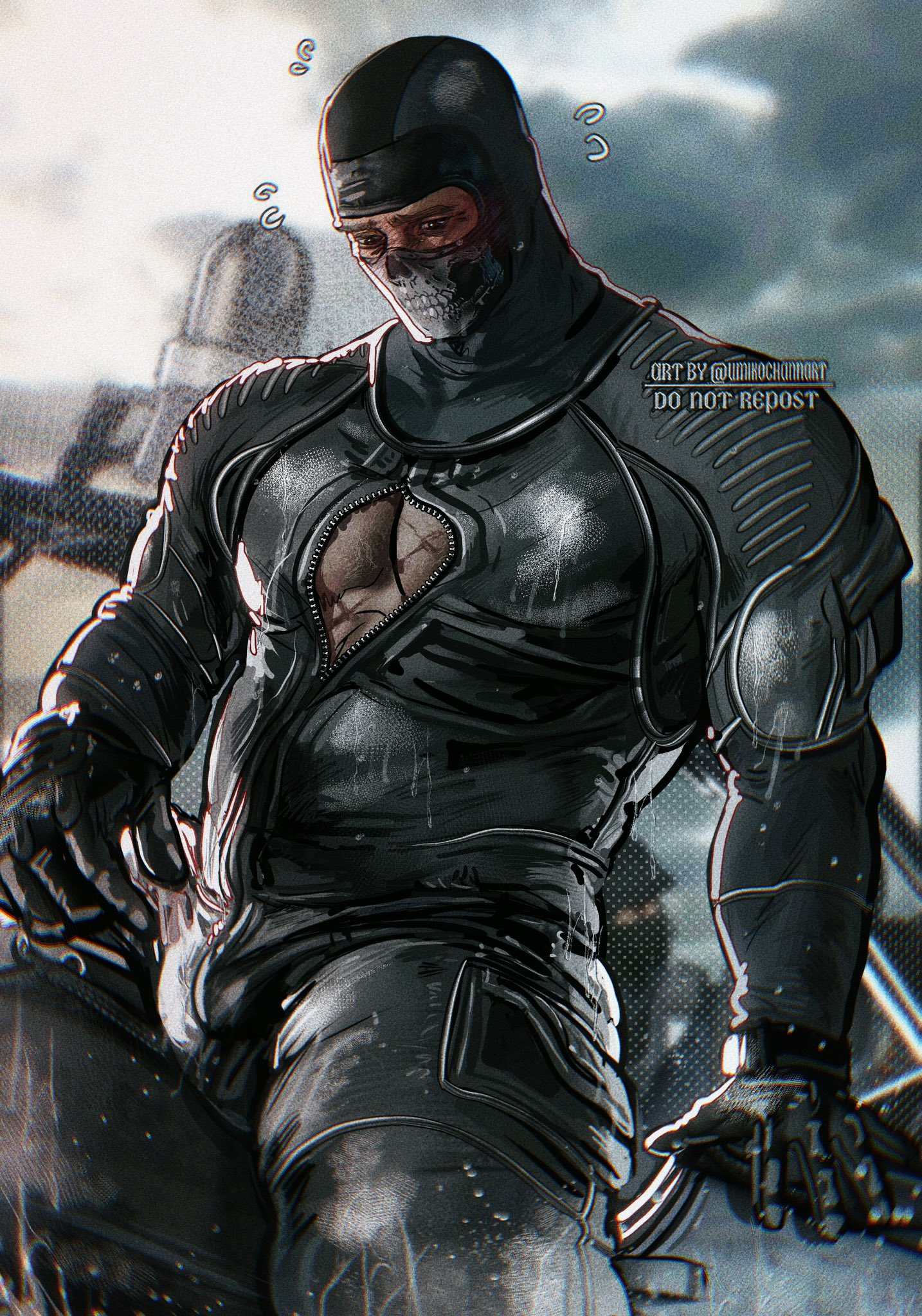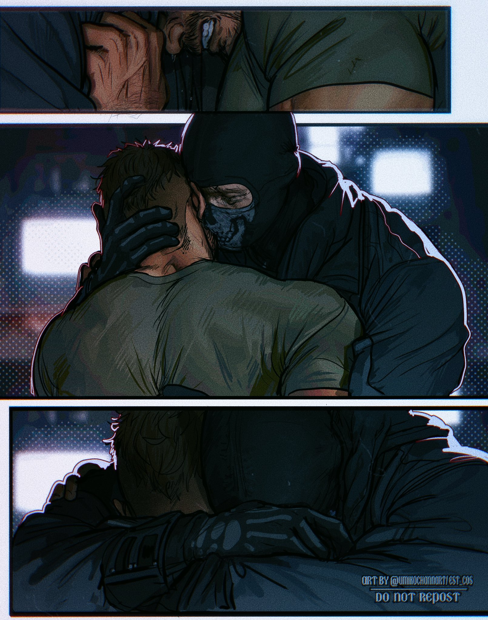 Мыло выскальзывает — классика, блядь, как в дешёвом порно. Плюхается на мокрый пол с таким звуком, будто бомба сдетонировала. Соуп замирает, лицо краснеет под бородкой, а Гоуст медленно поворачивается. Тишина такая, что слышен каждый вдох. Гоуст наклоняется, его перчатки всё ещё на руках (зачем он их не снял, а?), подхватывает мыло одним движением — грациозно, как ниндзя, но с этим хищным прищуром из-под маски. Протягивает Соупу, пальцы на миг соприкасаются, электричество бьёт током по венам. "В следующий раз держи крепче, МакТавиш", — бормочет Гоуст низким голосом, в котором сквозит не насмешка, а что-то тёплое, голодное. Глаза в глаза — и Соуп тонет в них, представляет, как срывает эту маску, как Гоуст прижимает его к кафелю, шепча "Ты мой, капитан".