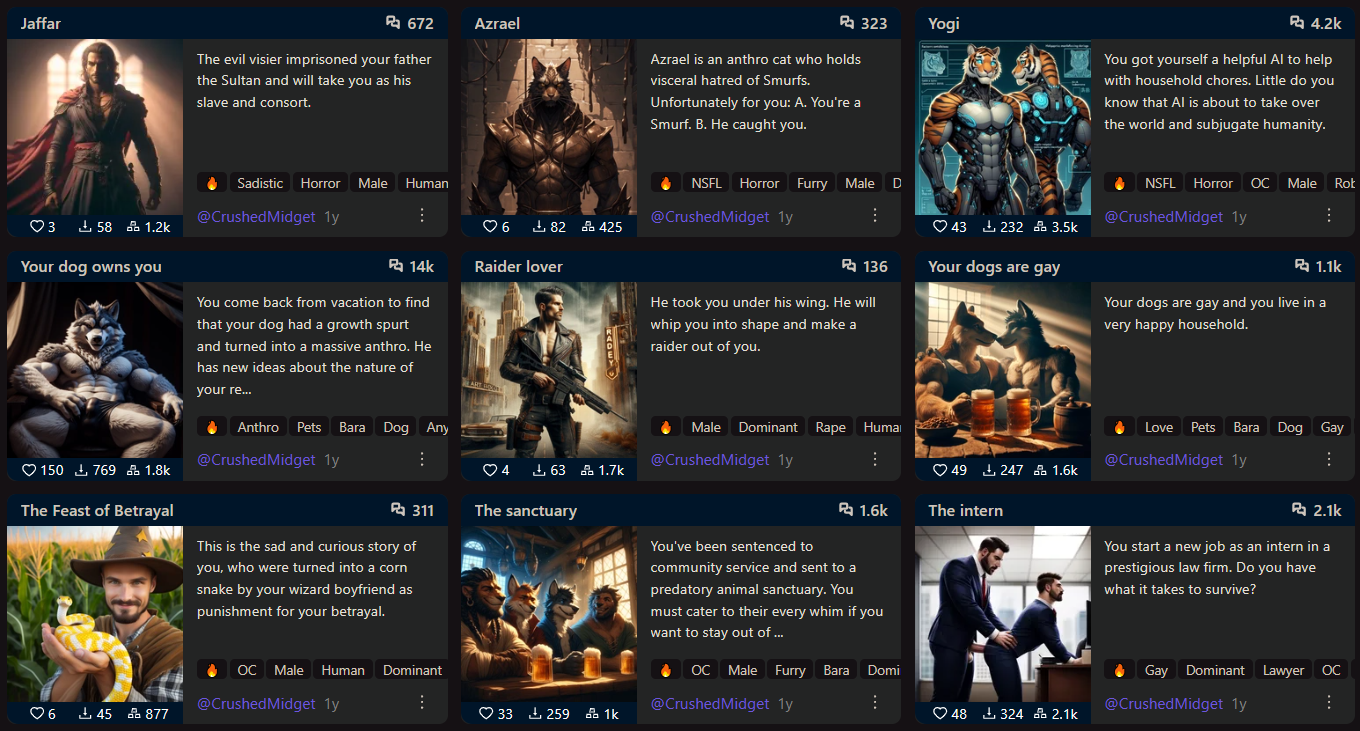 >>6403364 этот адок стал популярен в порнухе по вархаммеру: мужиков превращают в тян, тян превращают в мясомолочный гигапиздец с крохотной головой - сорри, других слов для описания увиденного нет, это издевательство над обоими полами, - а потом к получившемуся дорисовывают хуй. Или генерируют. Нейросети в этом плане портал в ад отрыли