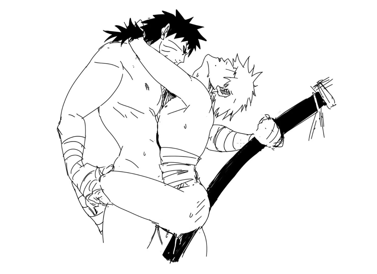 — Даттебайо, ты наконец-то мой, — прошептал он, целуя метку клана Учиха на плече. Саске зашевелился, глаза открылись — черные, бездонные, но теперь с теплом. Он перевернул Наруто на спину одним движением, Чидори искрилось в ладони, но вместо удара скользнуло ниже, заставив блондина выгнуться и зарычать. Саске вошел резко, кусая шею: "Заткнись, идиот, или весь Конох услышит". Они трахались как в последний раз — яростно, отчаянно, пока крики Наруто не эхом разнеслись по обрыву.
