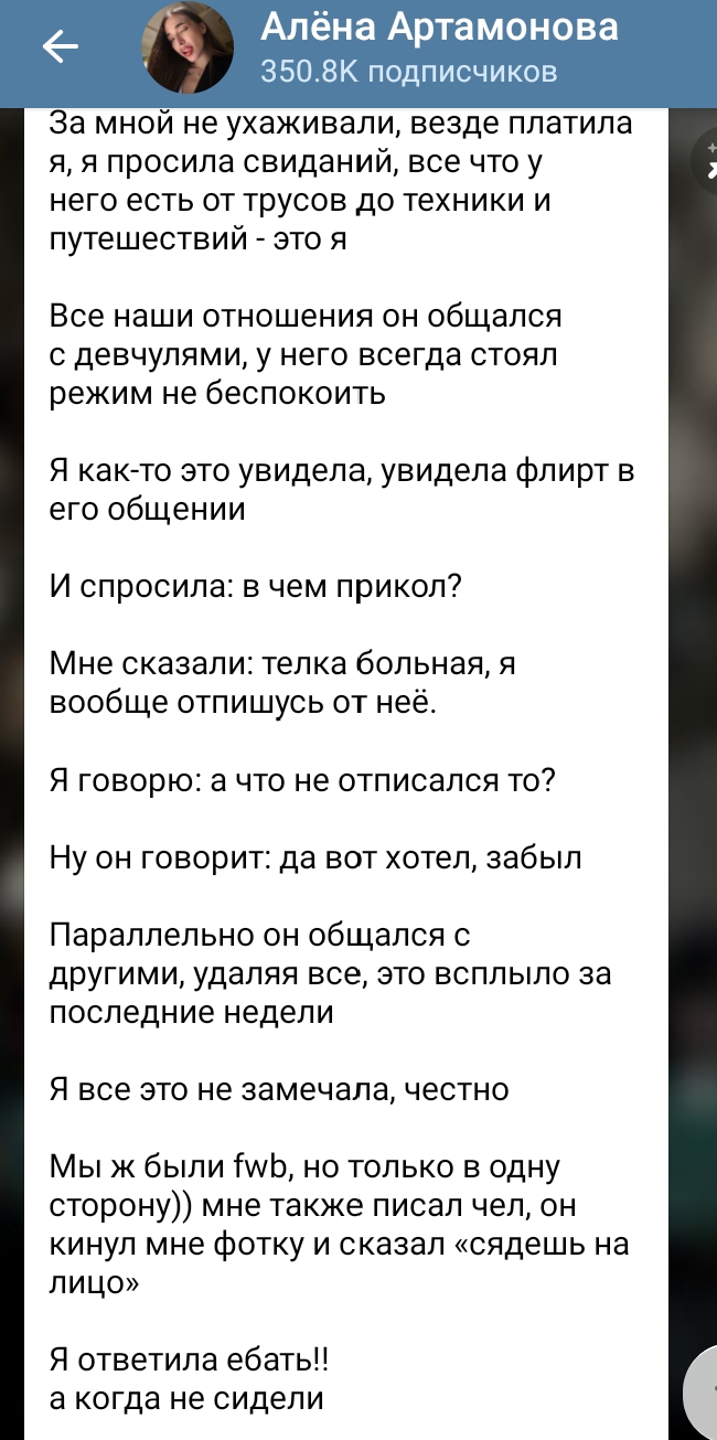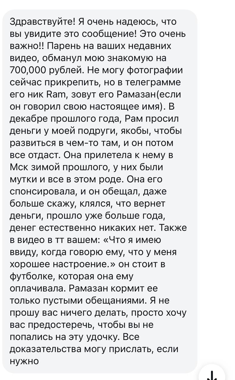 Очередной самовлюблённый чушок, с которым выставляли романтичный контент, изменил. Никогда не было и вот опять. Причем там прям отборный альфонс РАМАЗАН, который из тянок тянул бабки, весь в долгах.