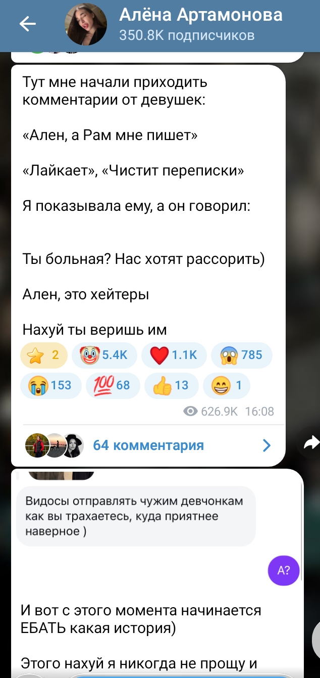 >>6408118 Плюсую. Моя знакомая состояла в том чате, где шиз мной притворялся, и вместе со всеми его травила, думая, что травит меня. Даже после его признания настаивала, что это всё я писала и что заслуживаю травли. При этом ирл мы с ней нормально общались, я б даже не заподозрила в ней такого. Мне потом рассказывали как она боялась, что я обо всём узнаю, и тоже буду ей как-то вредить. Хотя я просто сделала выводы о человеке и на этом всё.