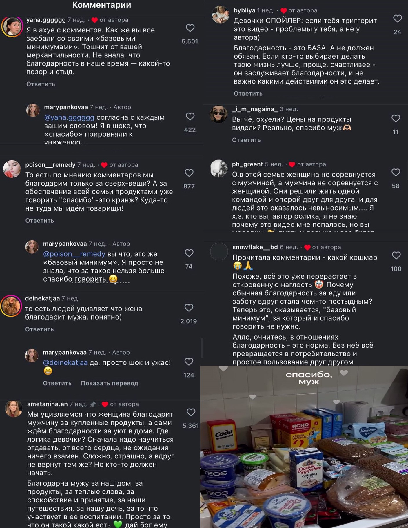 Из-за таких подстилусов и ее поддерживающих мы так и будем жить в всж аду, тянка благодарит мужа за обычные продукты по типу гречка, сметана, хлеб, молоко итд и посвящает этому аж отдельный рилс, иманжирую эти благодарные очко выбеливают и в жопу дают за гречку