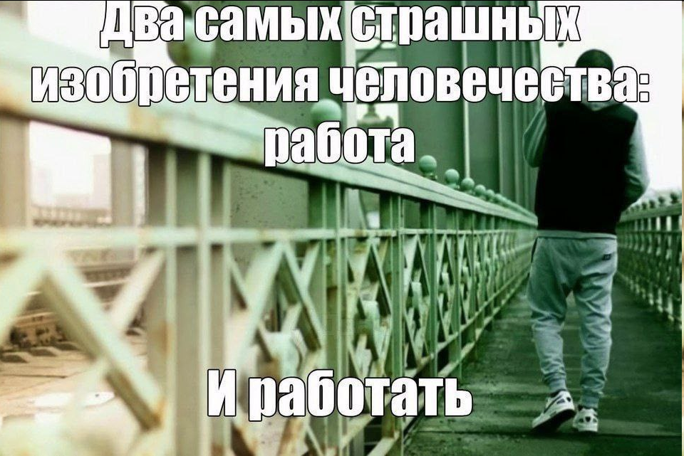 Ну и да ещё найти надо, на 1 вакансию куча людей (если не прям дно) и с ними воевать конкурировать доказывать что ты лучше и чтобы выбрали тебя, но я не лучше, я это я вот какая есть, наверняка есть кто то лучше и умнее. А если ты не будешь работать и если некому честь на шею то гг. В норм странах есть пособие какое то, чтобы не было такого пиздеца. А ещё рабочий день должен быть короче, часа 4-5, ну макс 6. Его сделали длинным чтобы лбди от безделья хуйнйе не занимались и не думали, ну наверное… Это ужасно 8 часов работать. А кто-то 12. Ужас