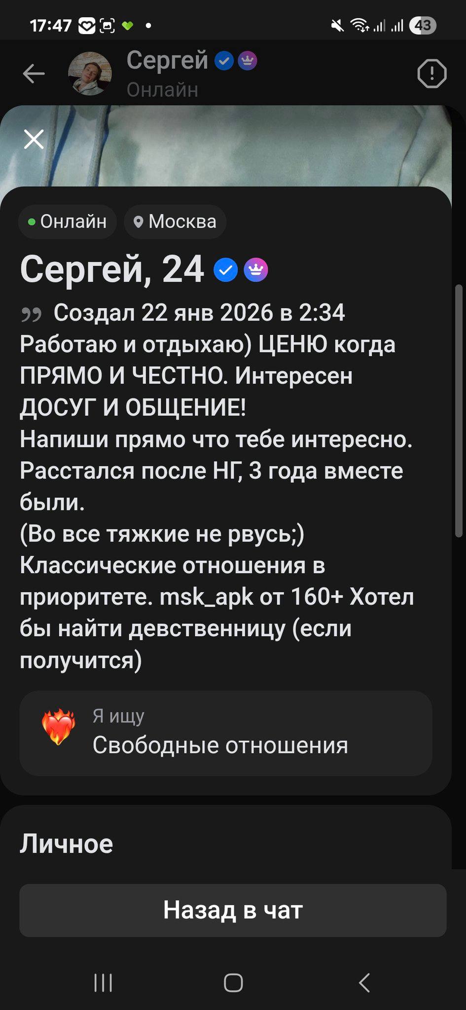 >>6416450 Да я дура, сама его слила и забанила на месяц, а потом разбанила и уже не ждала что напишет, но он написал поделившись какой-то радостной новостью о семье, я написала что рада. Это было в далёком 2017м в январе. Я пугливая и побоялась отношений, до сих пор боюсь