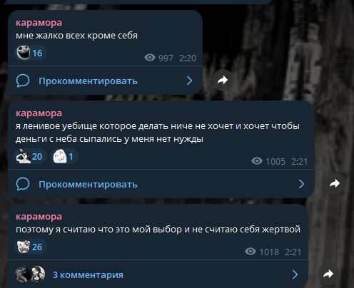 Кому-нибудь попадалась эта тян на ютубе? Лор: сирота, переехала в дс - город своей мечты. Все видео про то как ее всю жизнь кто-то унижает. По комментариям поняла, что в основном в подписчиках набрались чушки, пришедшие с канала какого-то блогера после этого видео (она в нем есть) https://youtu.be/tD89313sGW8 Блогер потом делал пост в тг, что неравнодушные ей задонатили 2 миллиона
