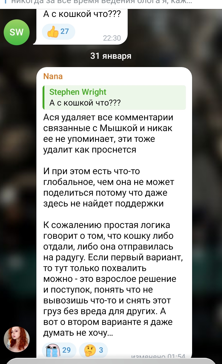 >>6422478 Чёт всплыло в памяти как Соня Грязь рассказывала об изменах Ресторатора своей жене в толчке 1703. И жена возненавидела Соньку за то, что она об этом рассказала. С Ресторатором жить продолжила естественно.